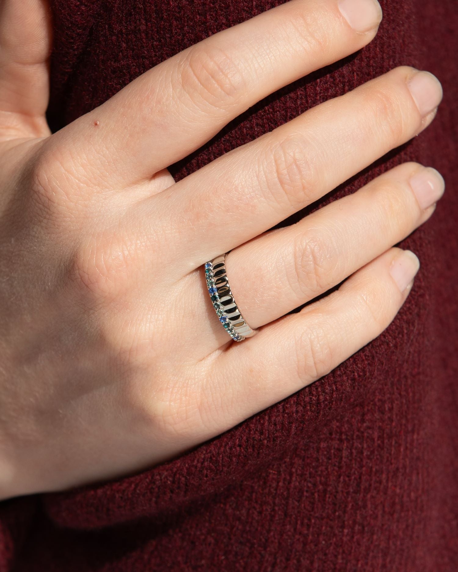 Bague en argent sertie d’oxydes. Un anneau structuré aux détails ciselés pour une brillance raffinée.