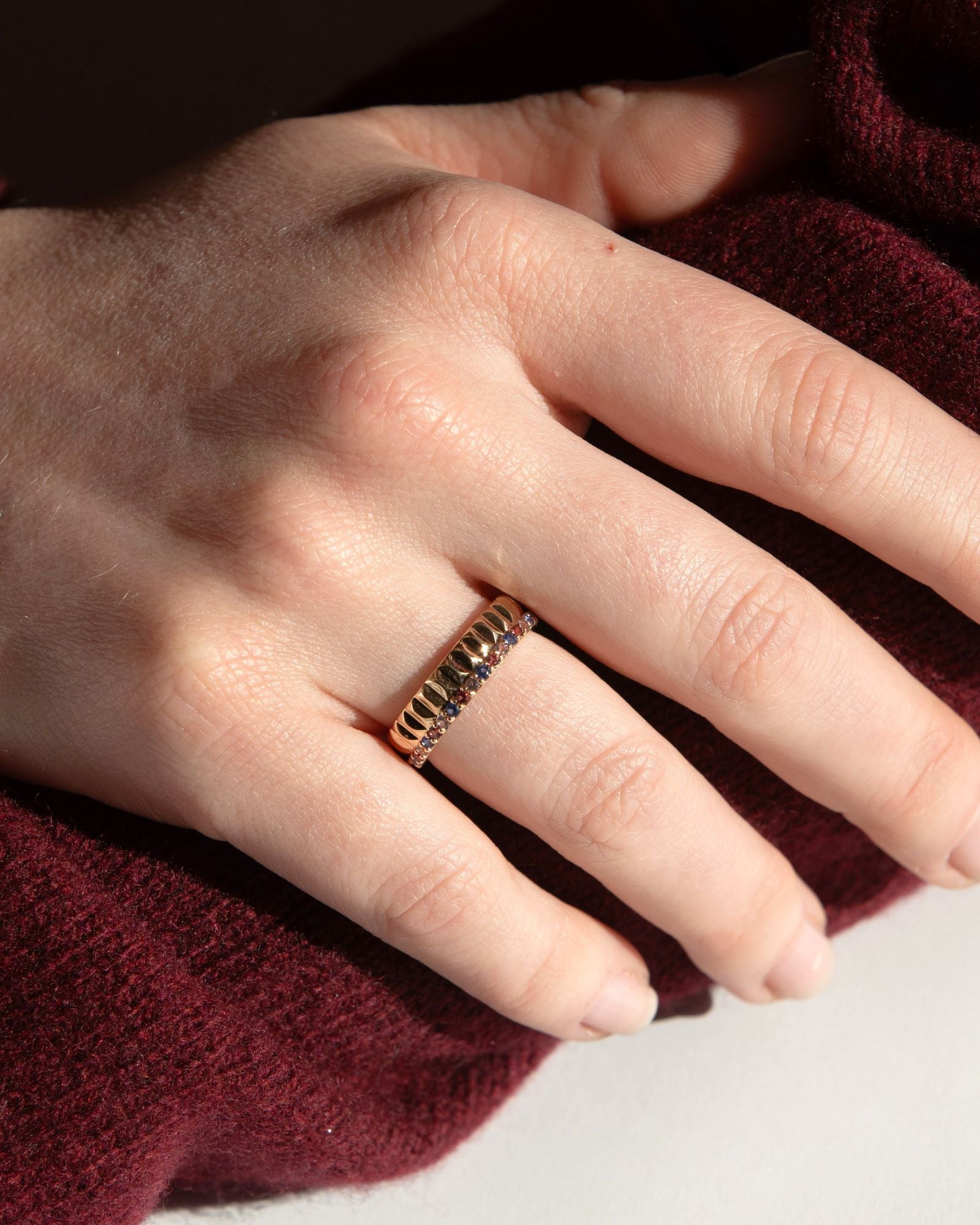 Bague en plaqué or sertie d’oxydes colorés. Un anneau structuré au style audacieux et lumineux.