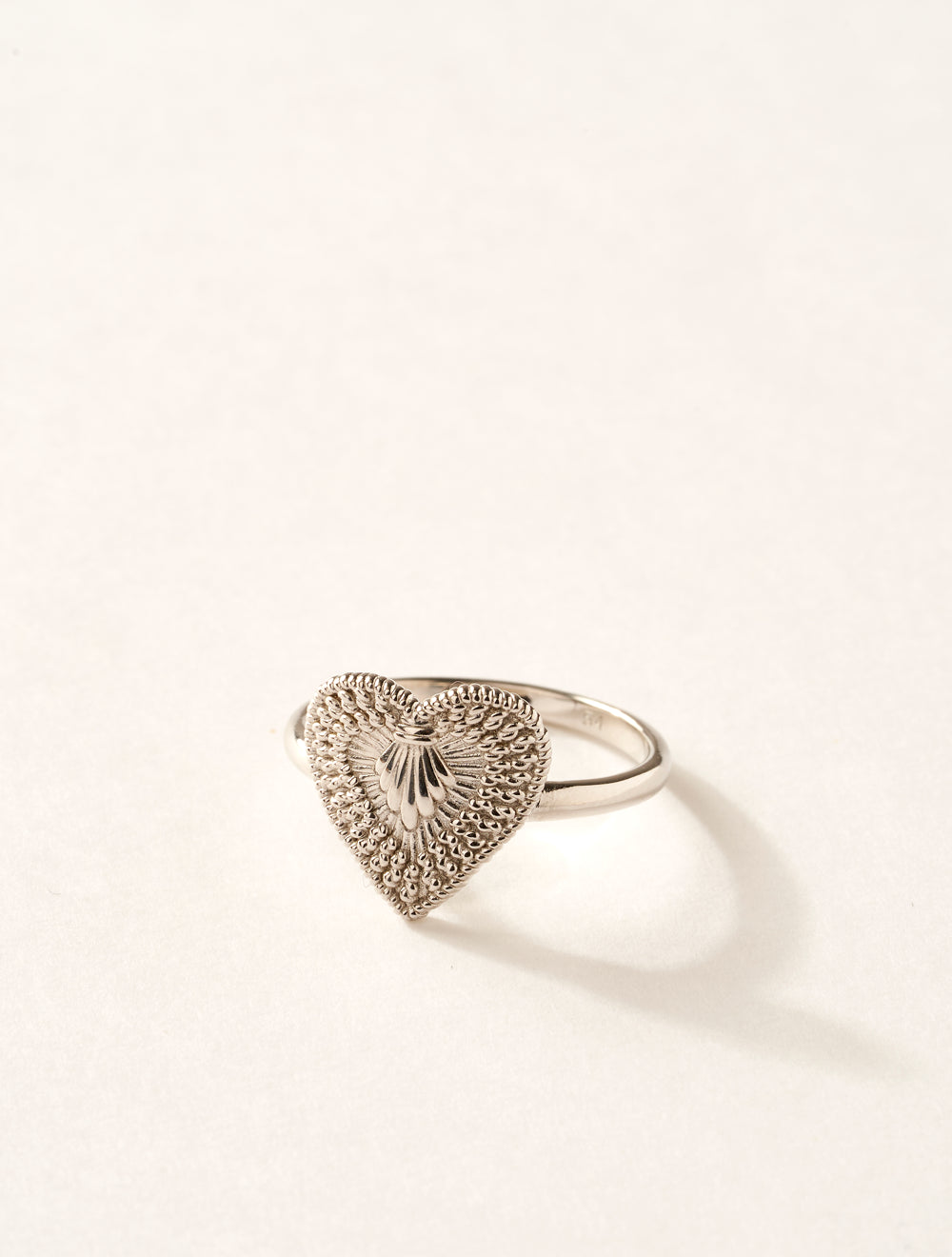 La ligne est inspirée du cœur Ex voto, très tendance cette saison. Nos stylistes ont travaillé à partir de papier tressé pour mettre en valeur les jeux de trames et de nouages caractéristiques du tissage. Le cœur est délicatement orné d'une pampille en oxyde.