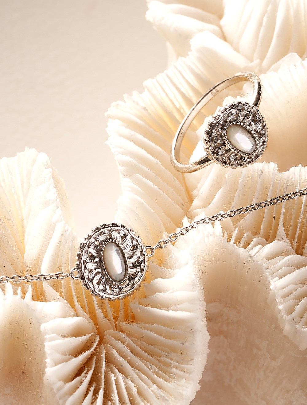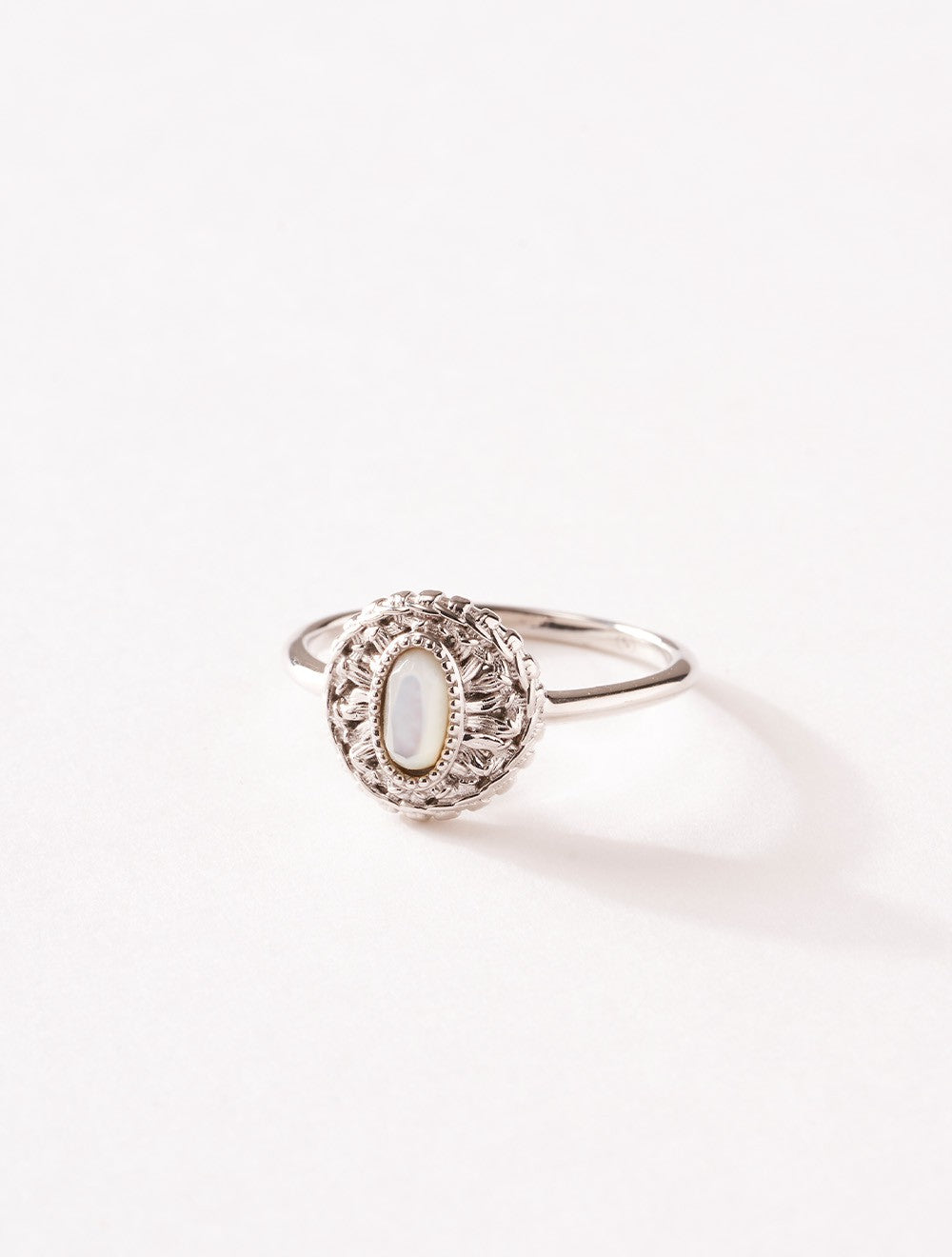 Inspirée du tissage, cette ligne joue sur les textures et l’effet de travail « fait main ». L’effet de matière texturé est sublimé de nacre cabochon au serti clos perlé. Cette bague texturée ira avec toutes vos tenues.