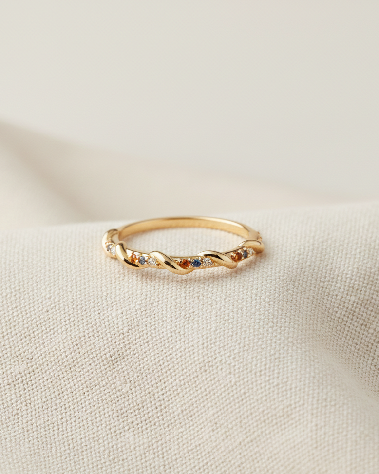 Bague fine et lumineuse, inspirée des finitions couture et du geste précis de l’atelier. Sa ligne spiralée, élégante et délicate, joue le mouvement sur le doigt, ponctuée d’oxydes de zirconium multicolores pour une touche précieuse. À porter seule pour un look minimal chic, ou en accumulation pour un effet plus mode.