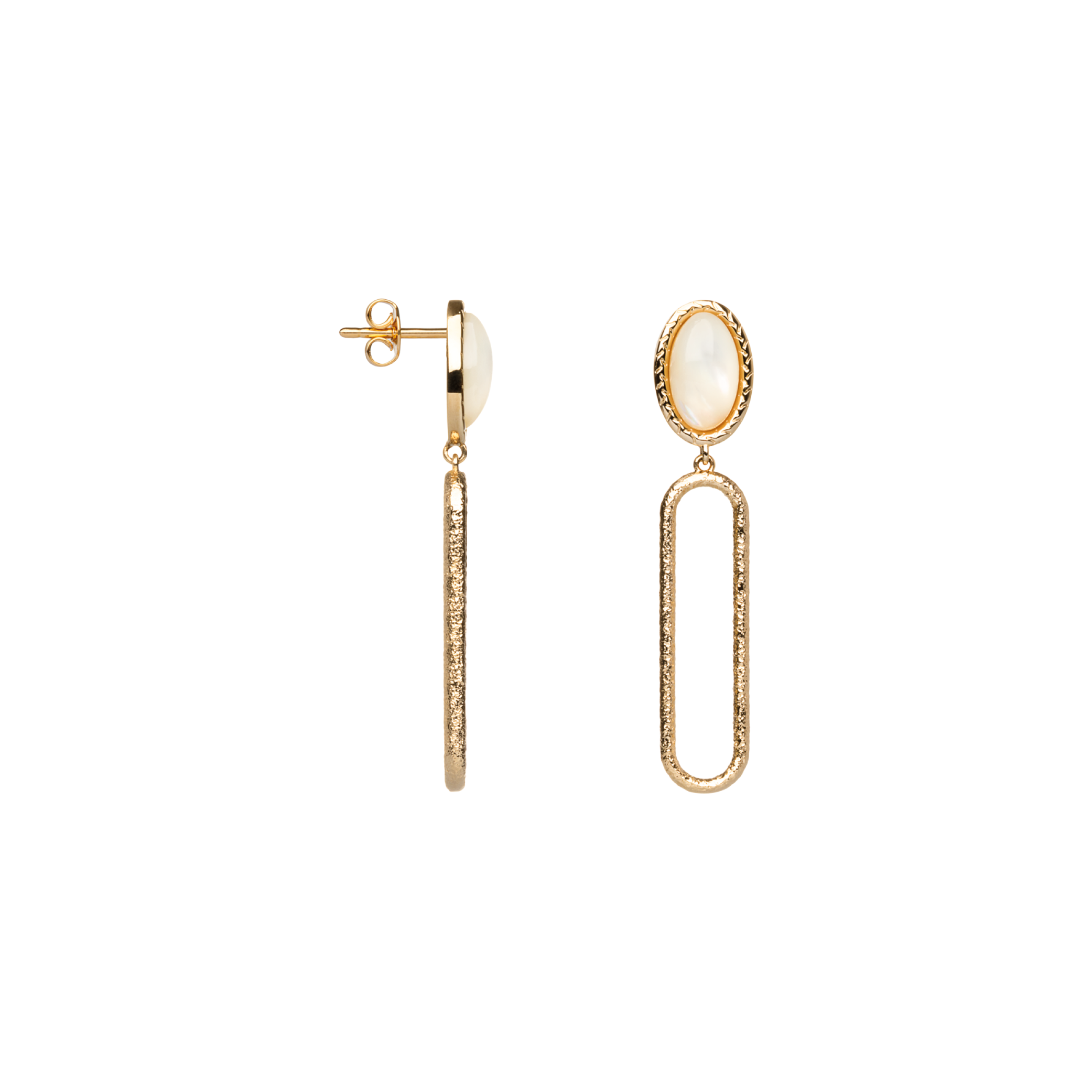 Boucles d'oreilles pendantes Aussière en plaqué or 3 microns, serties de nacre blanche.