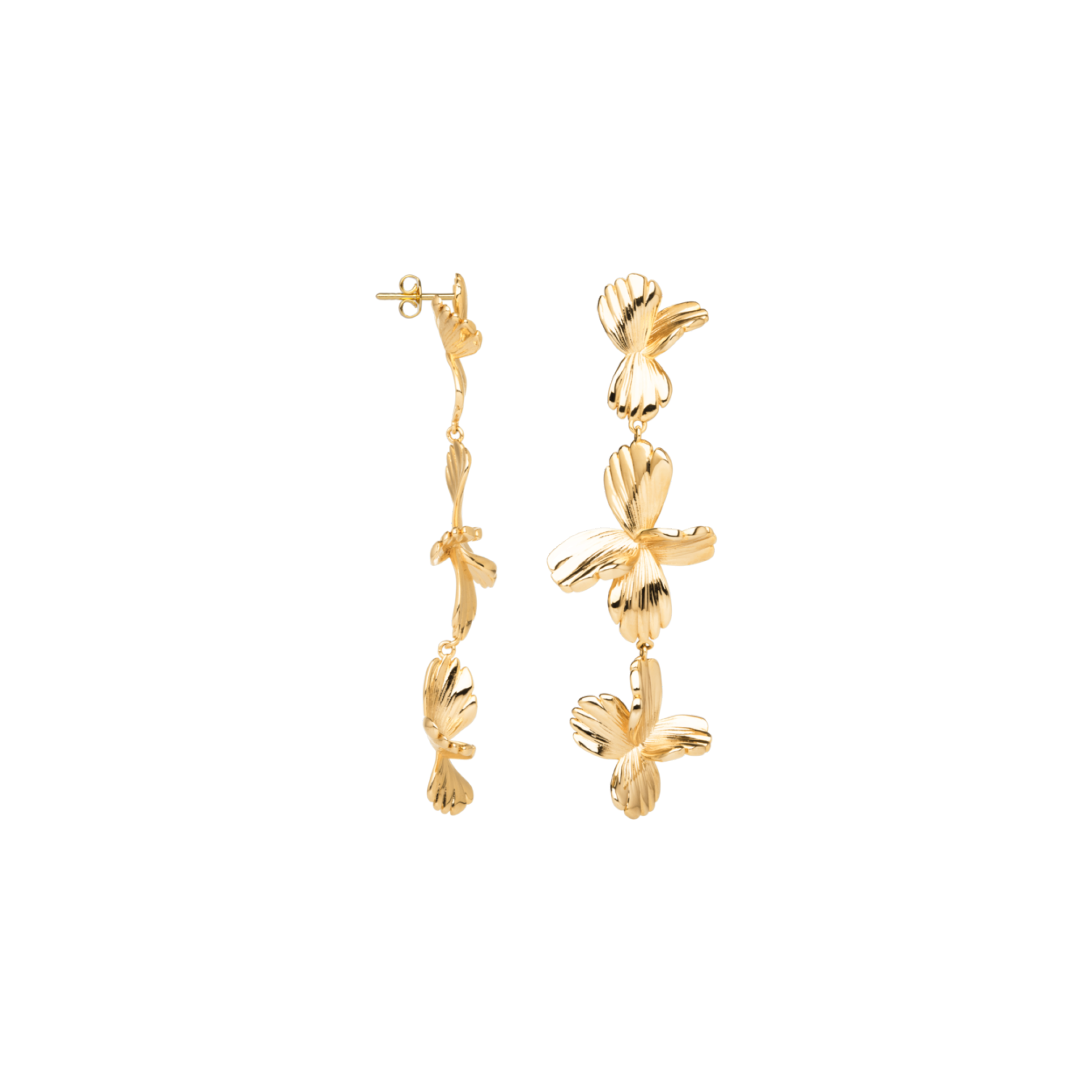 Boucles d’oreilles pendantes en forme de fleur. Finition texturée et design lumineux pour capter la lumière.