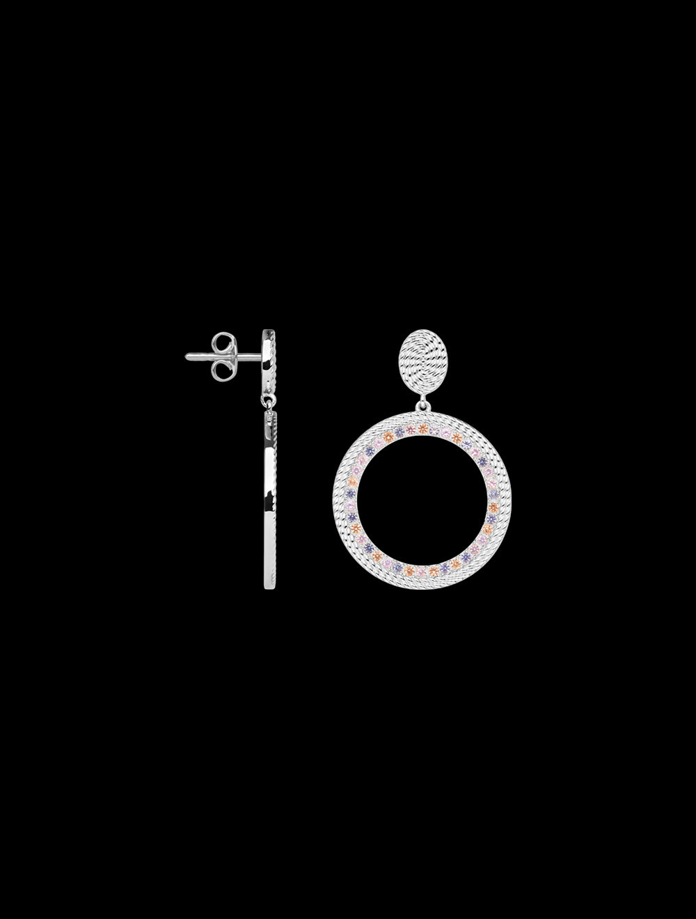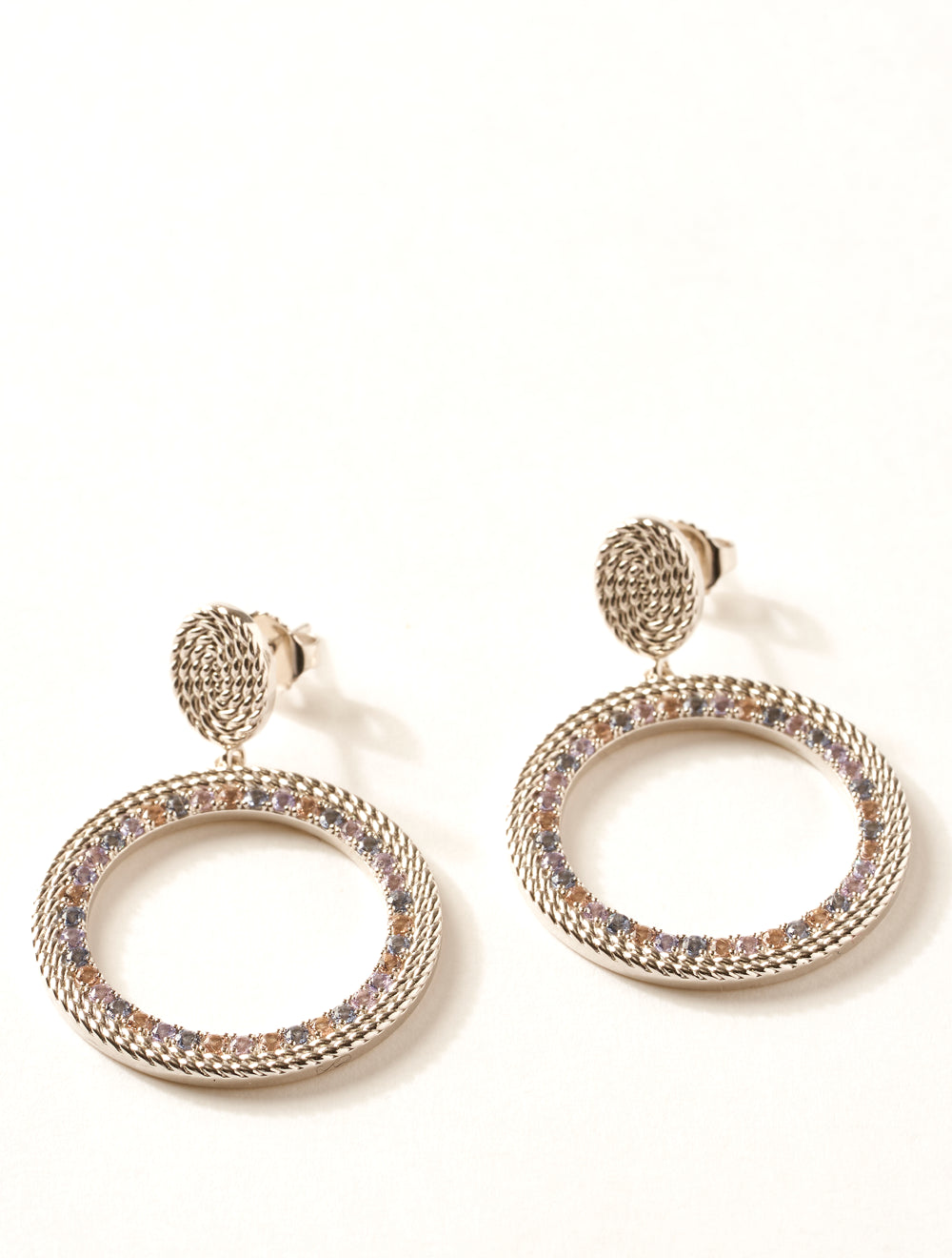 Boucles d'oreilles pendantes avec des effets de matières et des oxydes serties aux ton bleus, roses et violets.