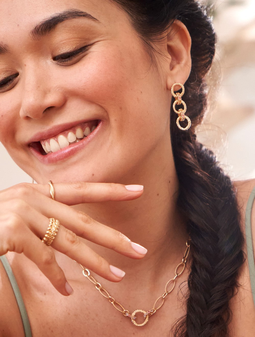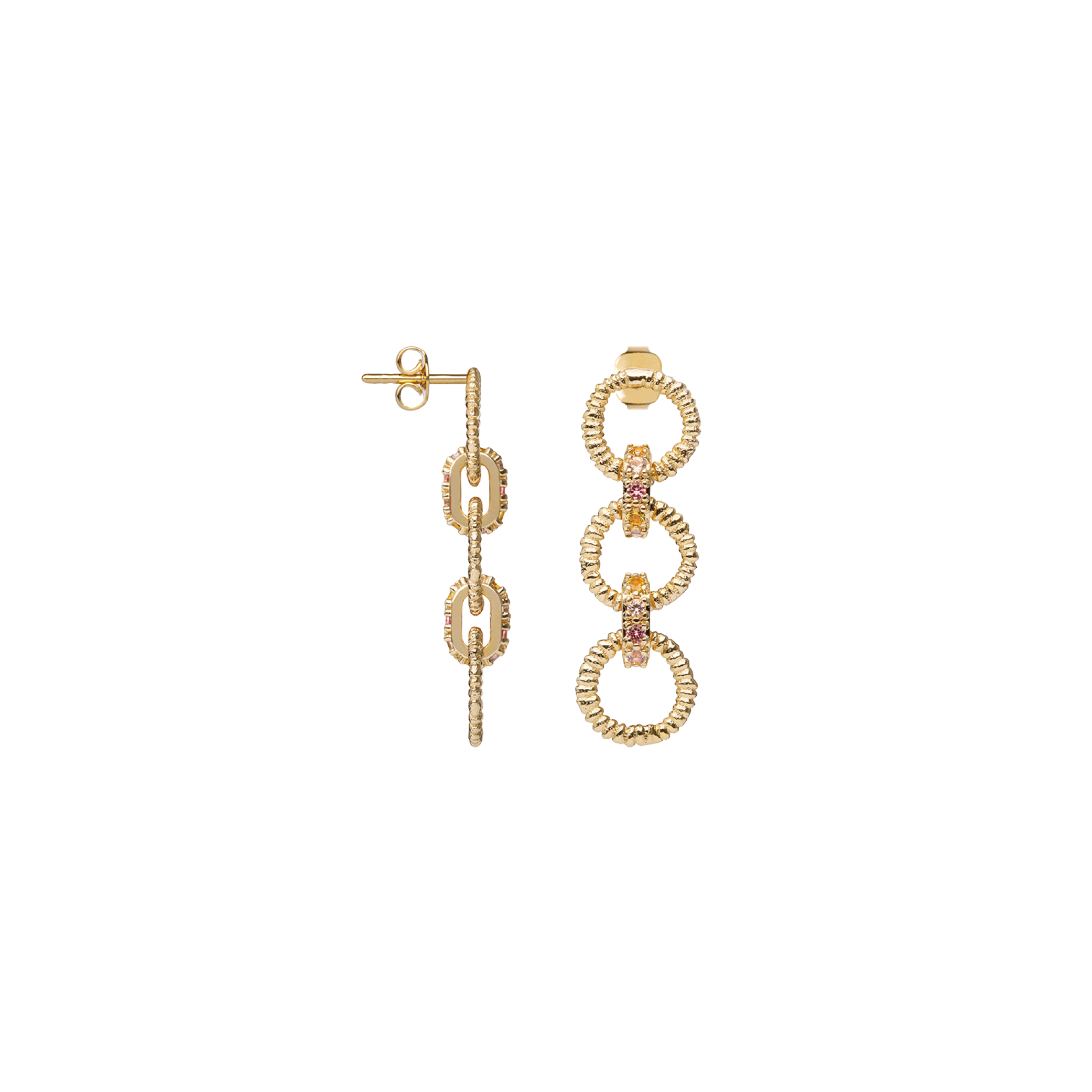 Boucles d'oreilles pendantes aux anneaux irréguliers paré d'oxydes de couleurs. Les anneaux aux bords dentelés sont maintenus par de superbes liens sertis.