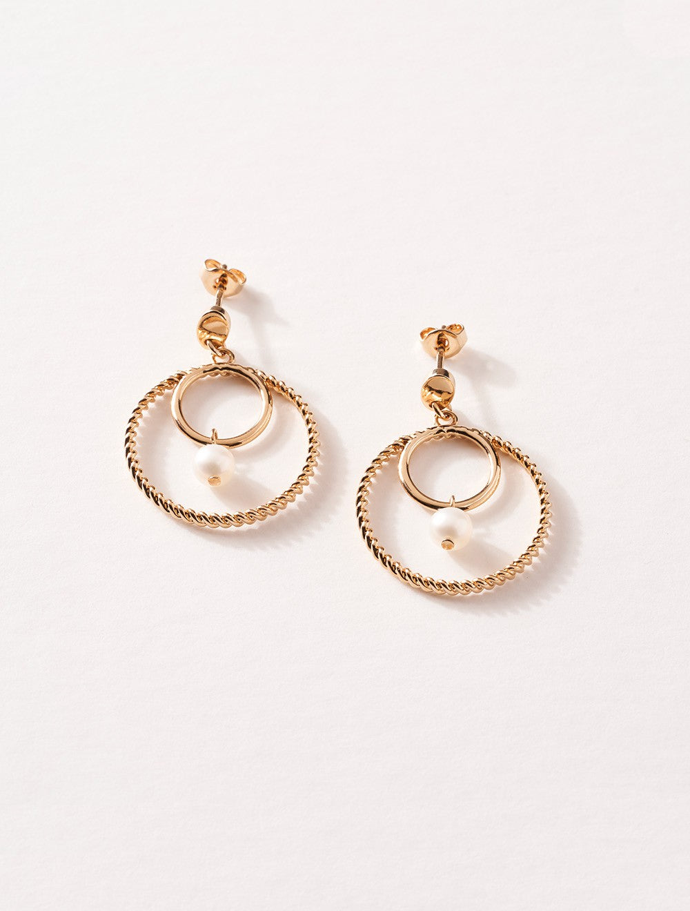 Les boucles d'oreilles plaqué or de la ligne Lin sont un mélange de fils de métal et de perles. La perle blanche d'imitation est ici mise en avant au travers de fils lisses et torsadés. Elégance et modernité pour ces pièces intemporelles.