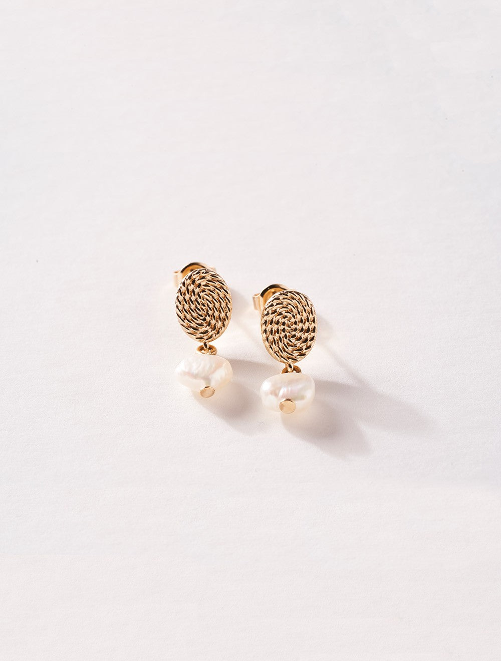 Les boucles d'oreilles plaqué or sont féminines et gracieuses. La ligne Cabestan est discrète, sublimée de perle blanche. Sur cette ligne, un mélange de perles baroques d'imitation et de médailles matiérées. Elégance et modernité pour ces pièces intemporelles.