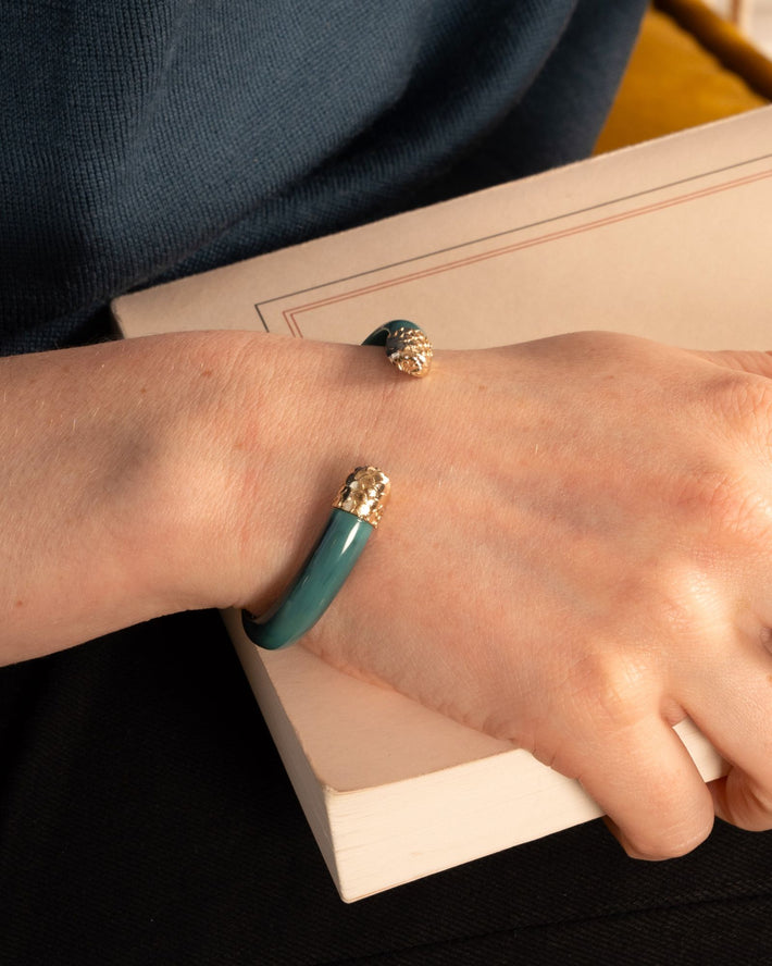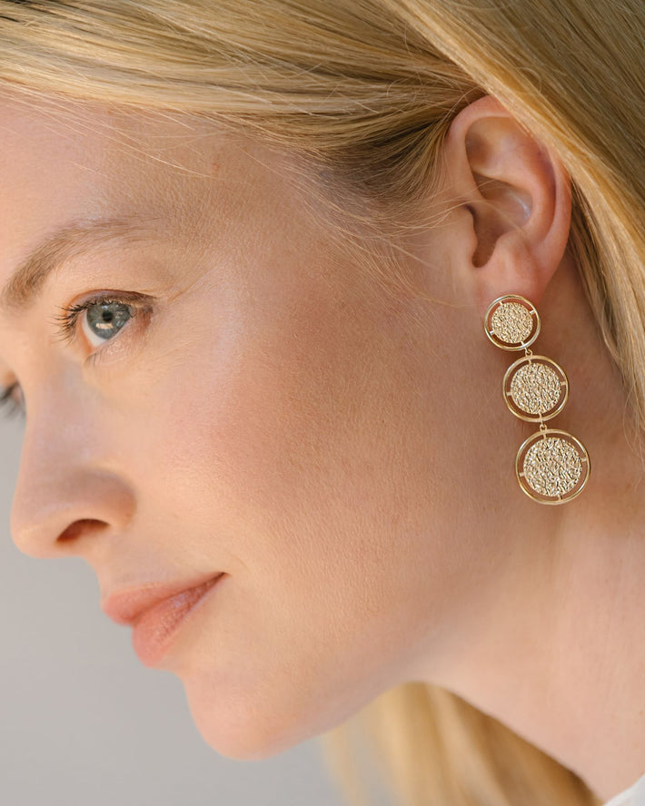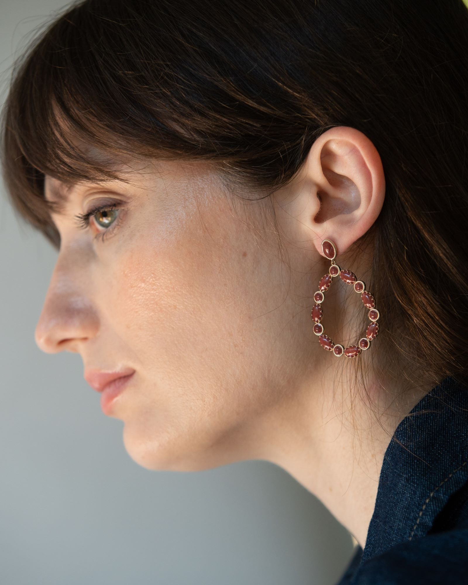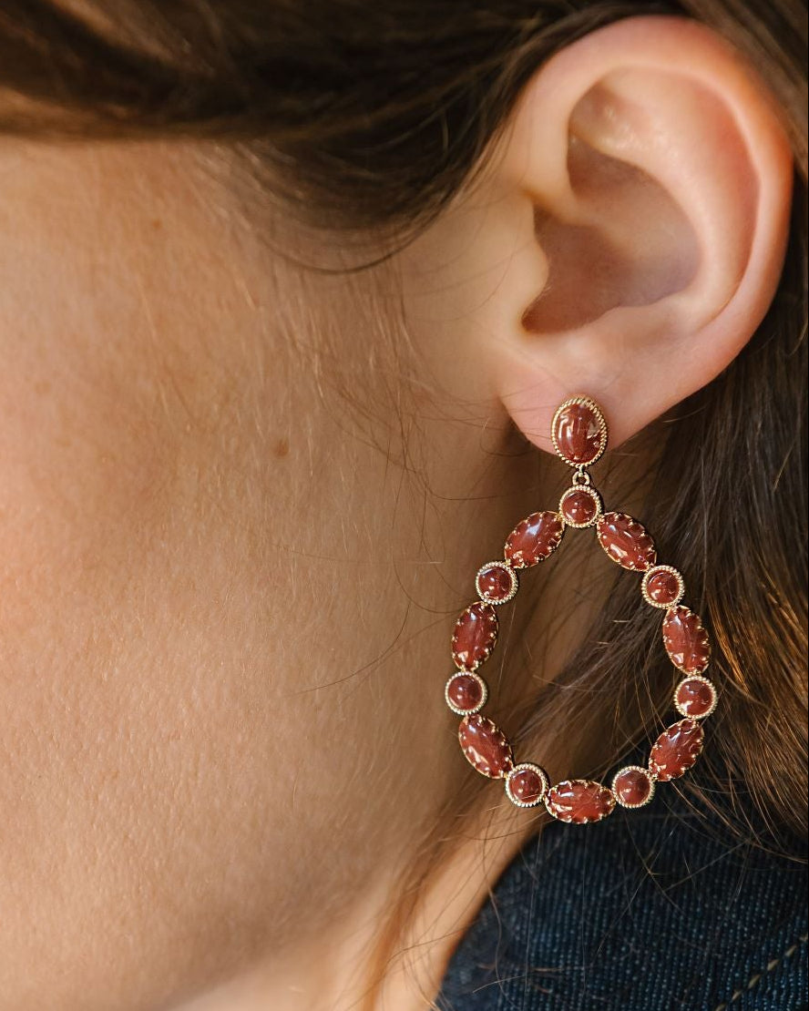 Boucles d'oreilles pendantes au finitions laquées et serti clos décoratif. Un design affirmé à l’esthétique vintage.