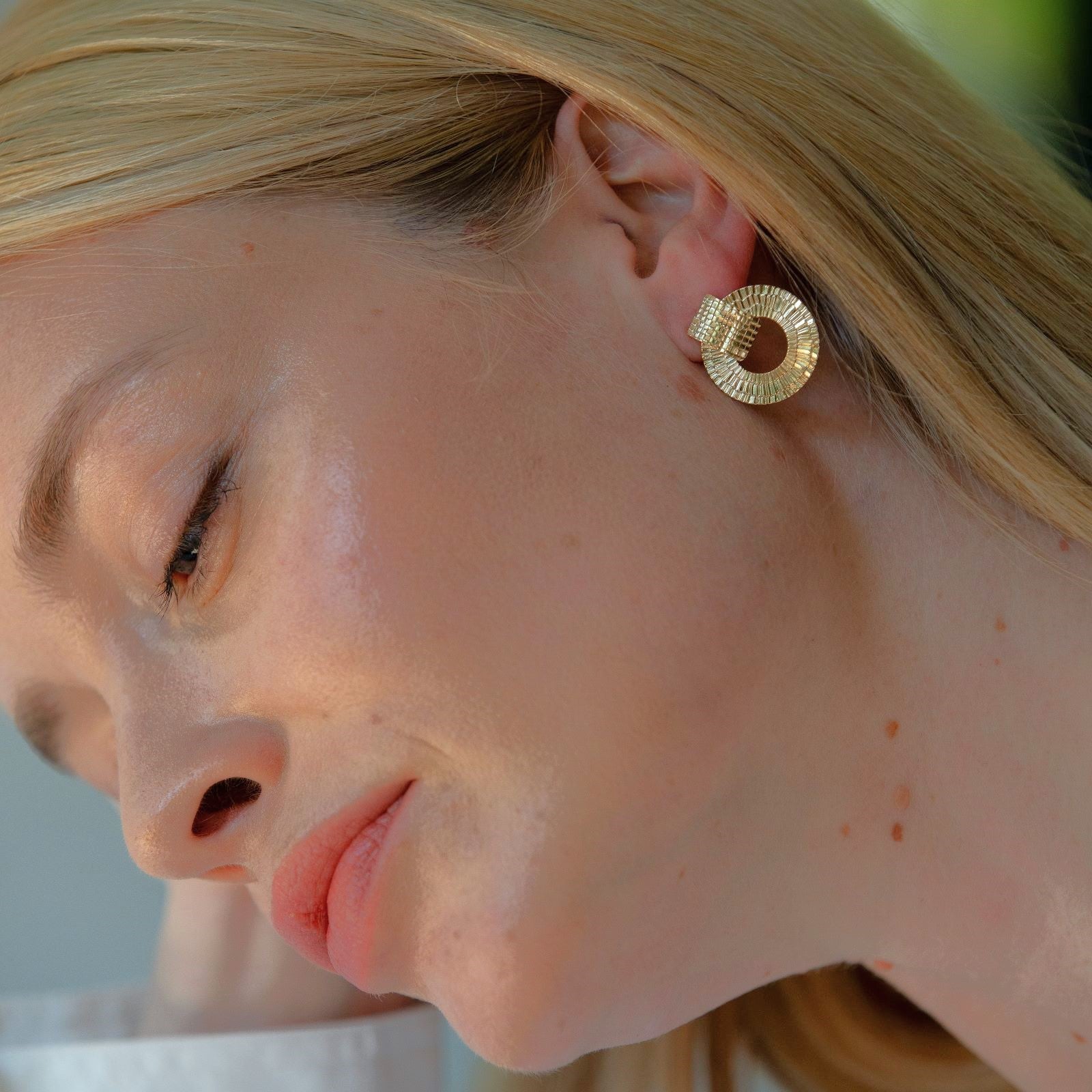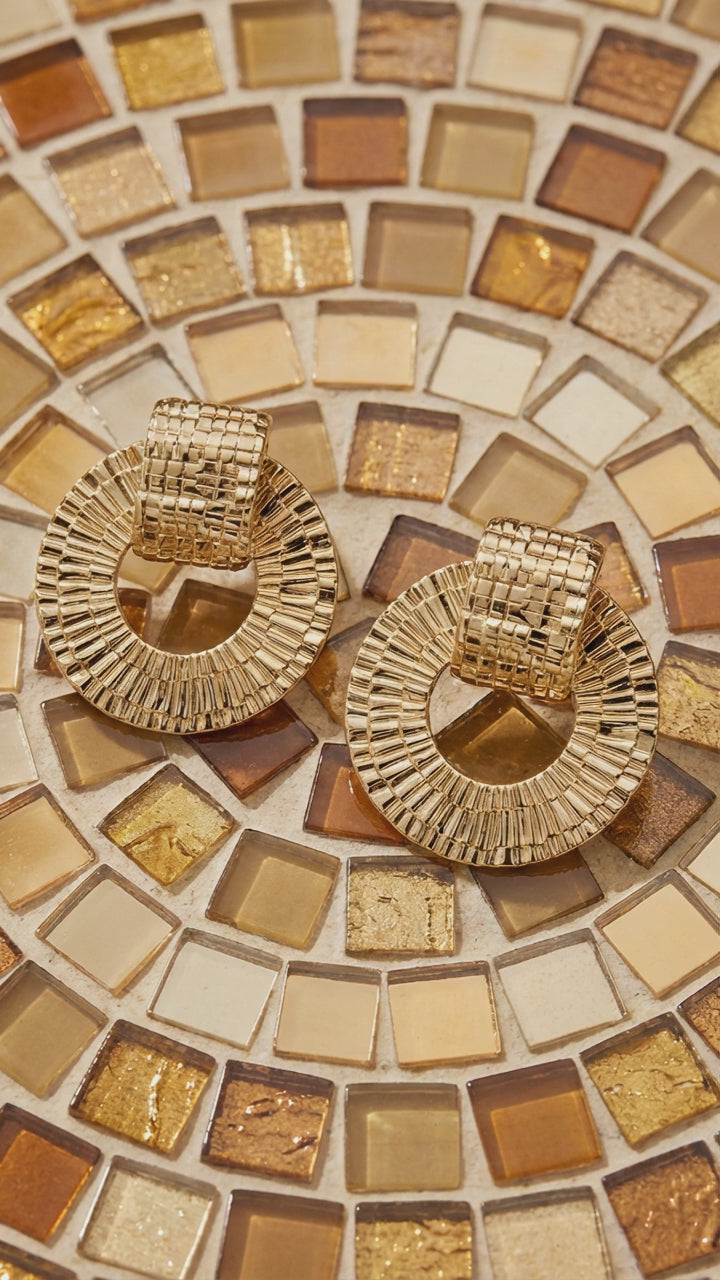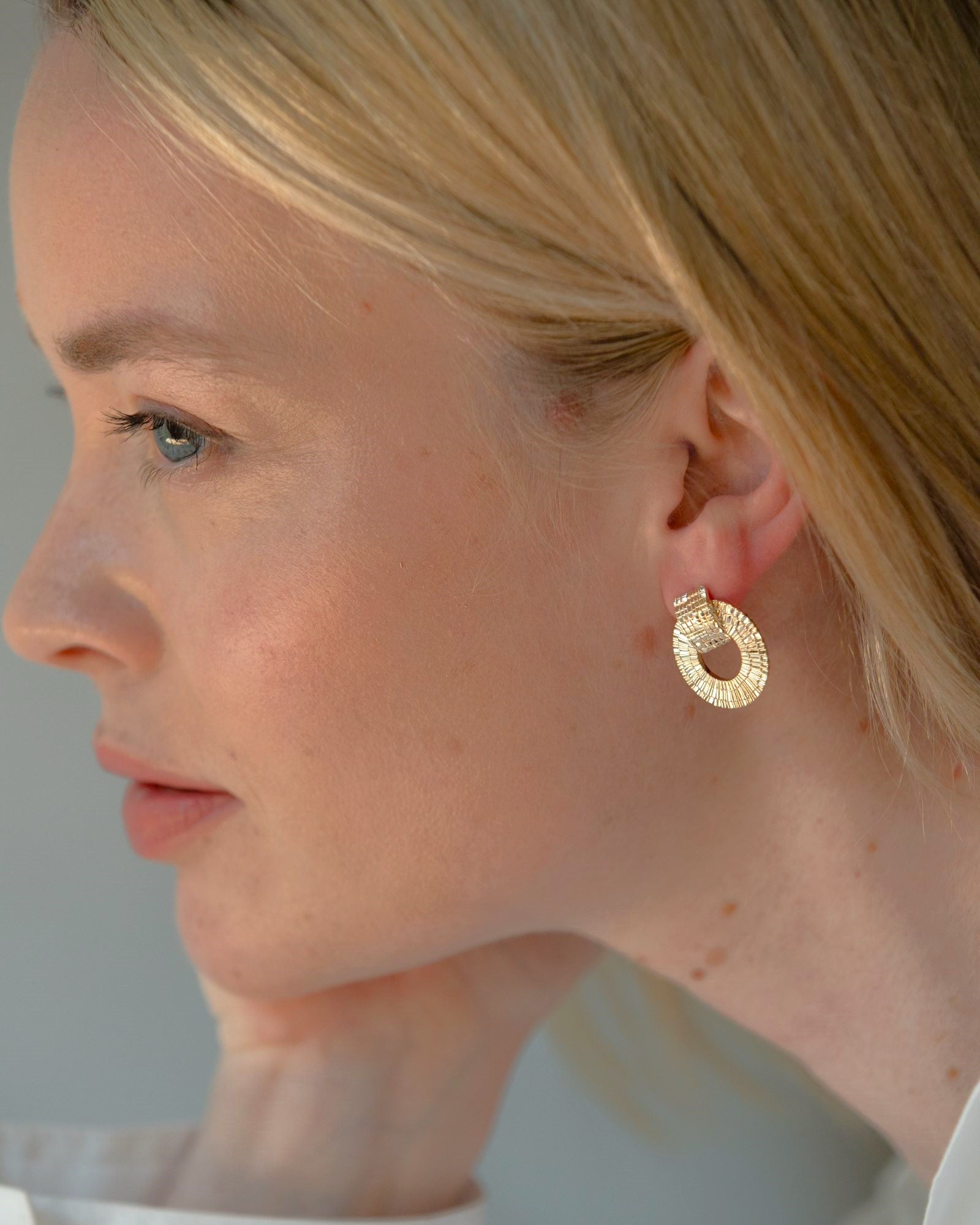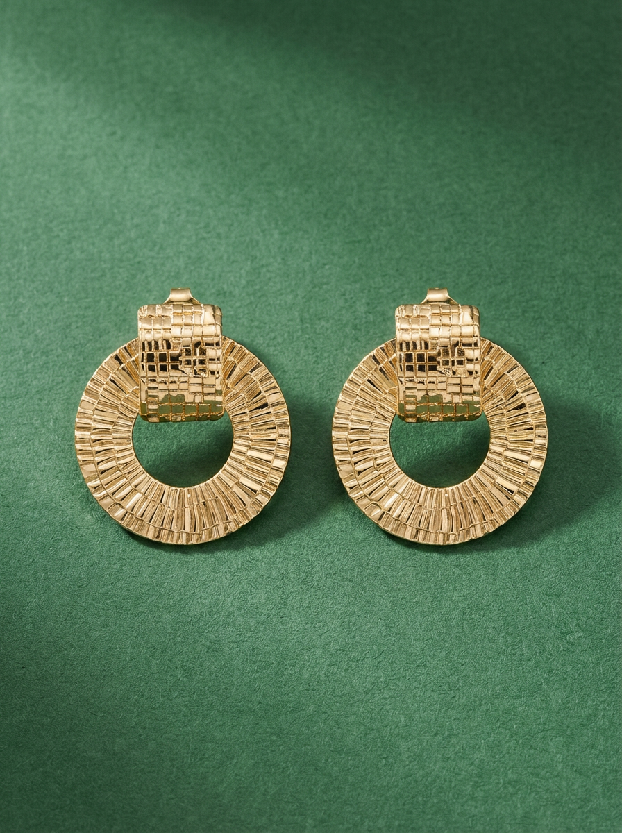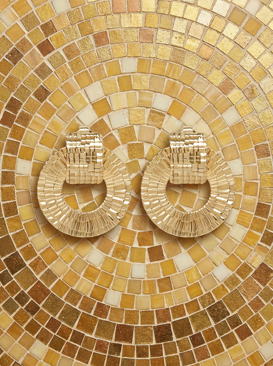 Boucles d’oreilles plaqué or à motif ciselé. Ligne graphique et structurée inspirée de la mosaïque antique. Style contemporain et affirmé.