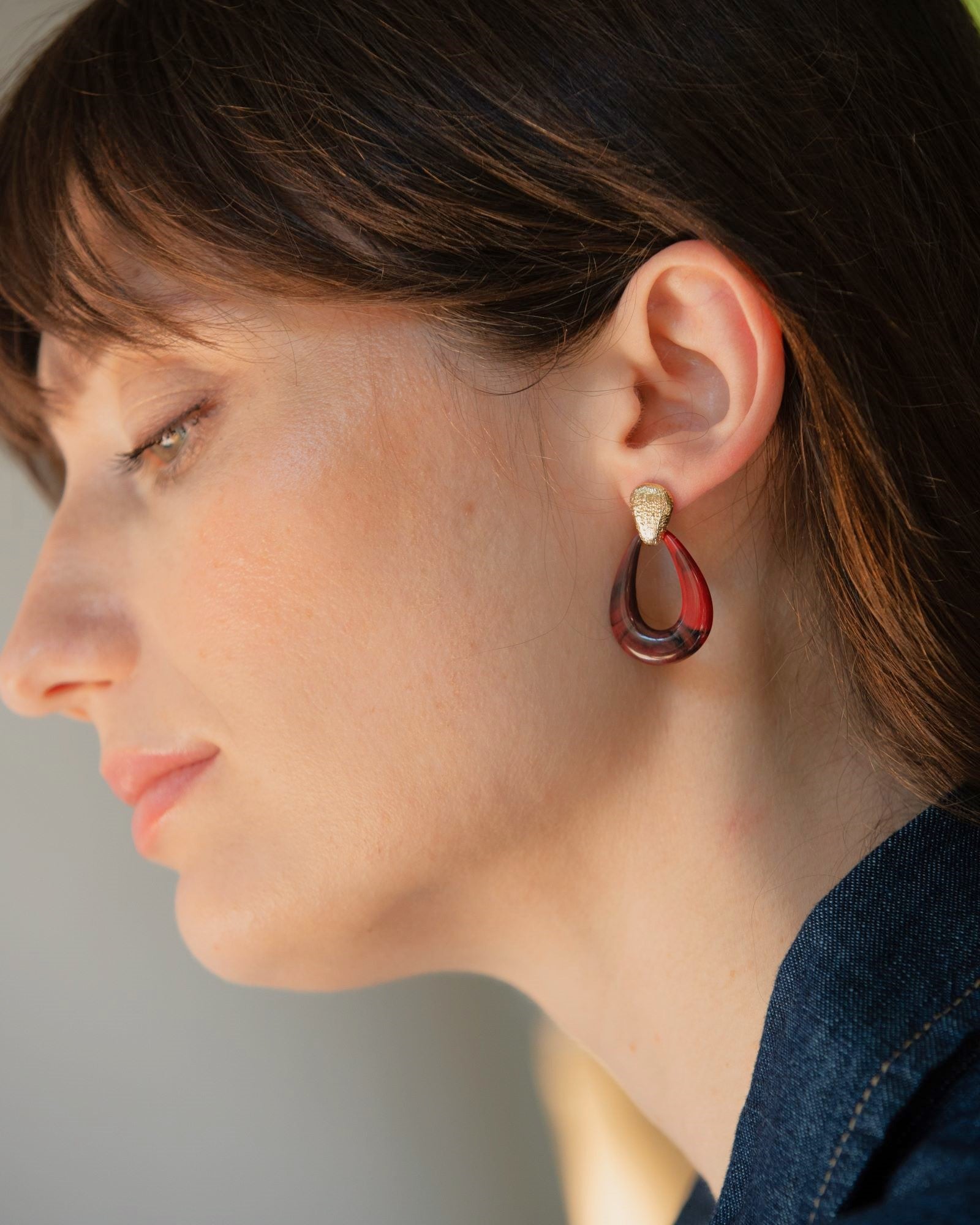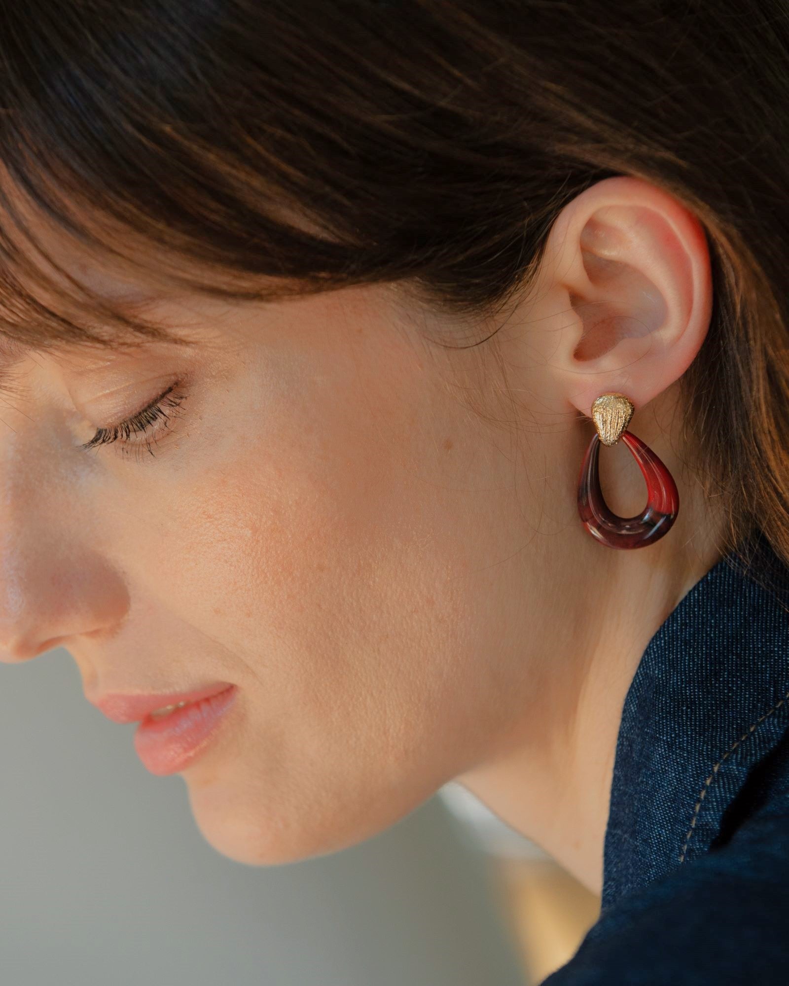 Boucles d’oreilles pendantes en plaqué or et résine terre cuite. Design texturé et coloré.
