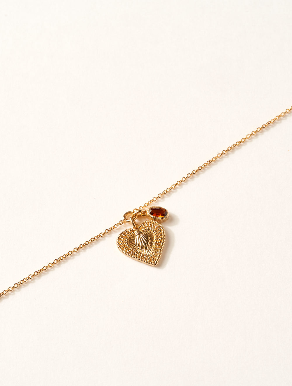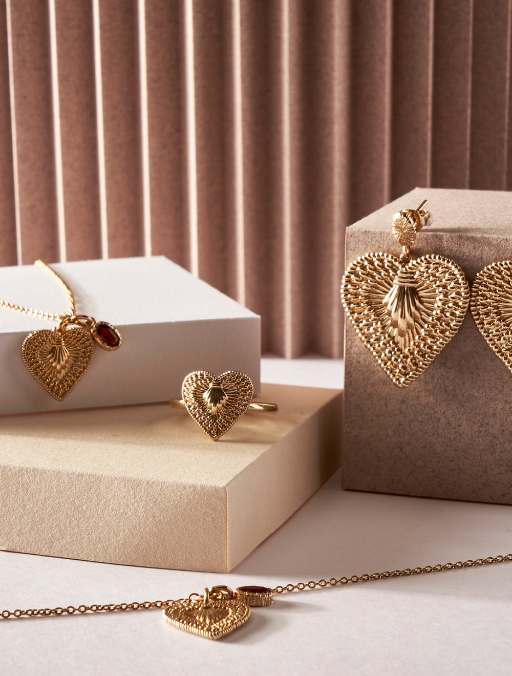 La ligne est inspirée du cœur Ex voto, très tendance cette saison. Nos stylistes ont travaillé à partir de papier tressé pour mettre en valeur les jeux de trames et de nouages caractéristiques du tissage. Le cœur est délicatement orné d'une pampille en oxyde.