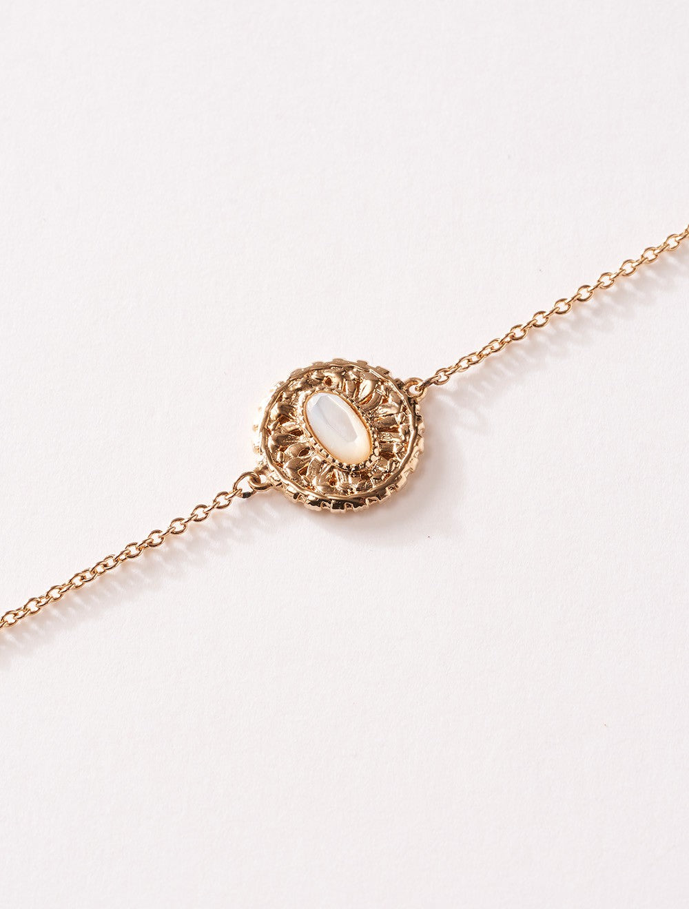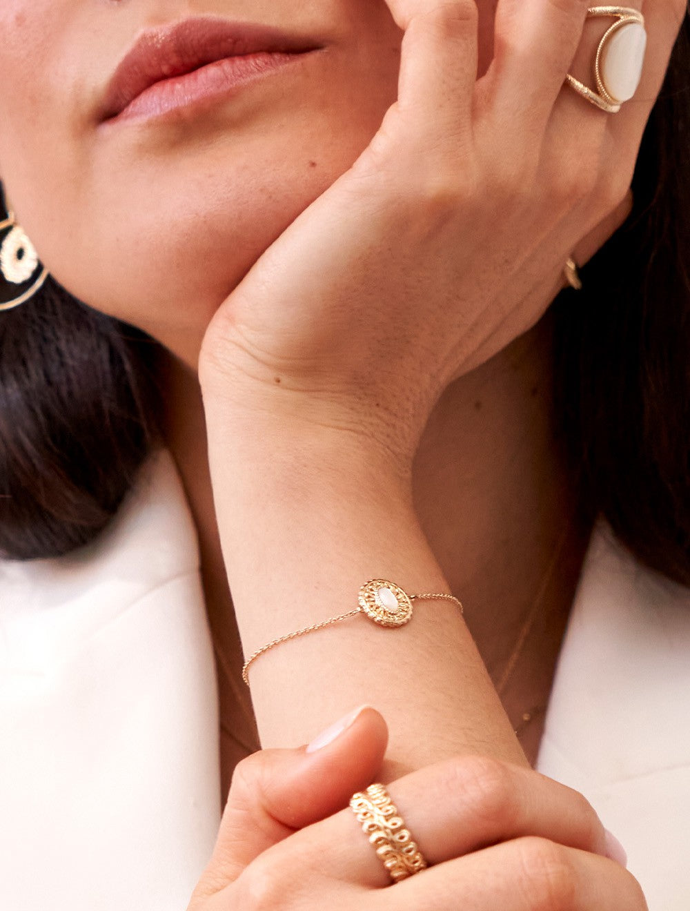 Inspirée du tissage, cette ligne joue sur les textures et L'effet de travail « fait main ». L'effet de matière texturé est sublimé de nacre cabochon au serti clos perlé. Ce bracelet texturé ira avec toutes vos tenues.