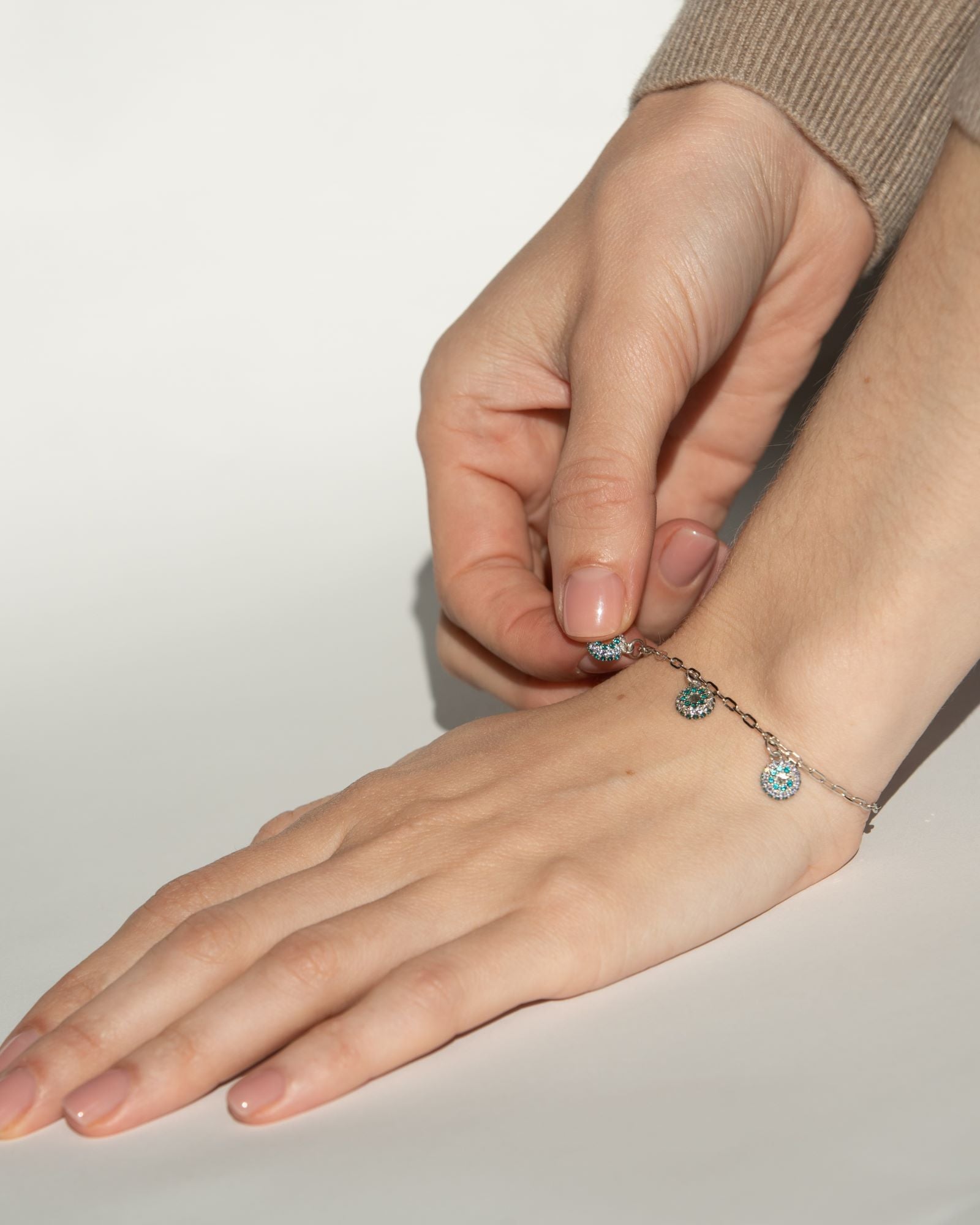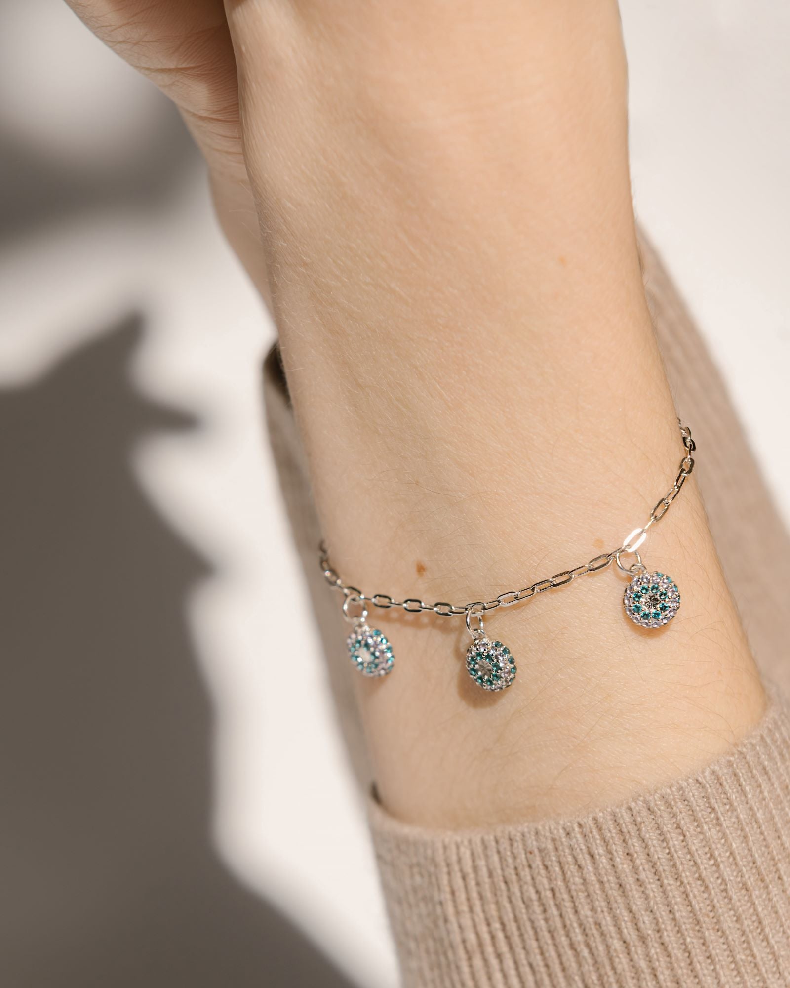 Bracelet en argent orné de trois pampilles serties d’oxydes bleus. Chaîne à maillons et éclats colorés pour un porté tout en finesse.