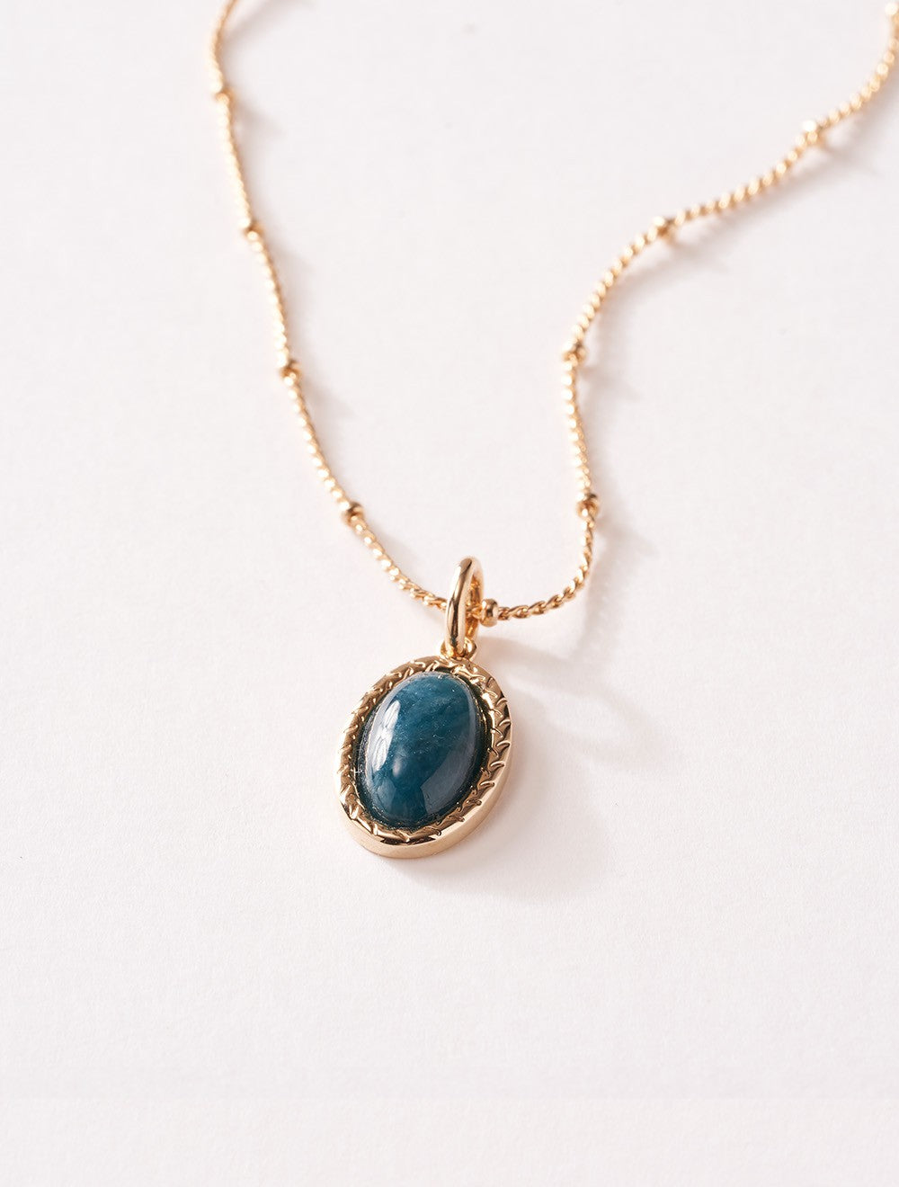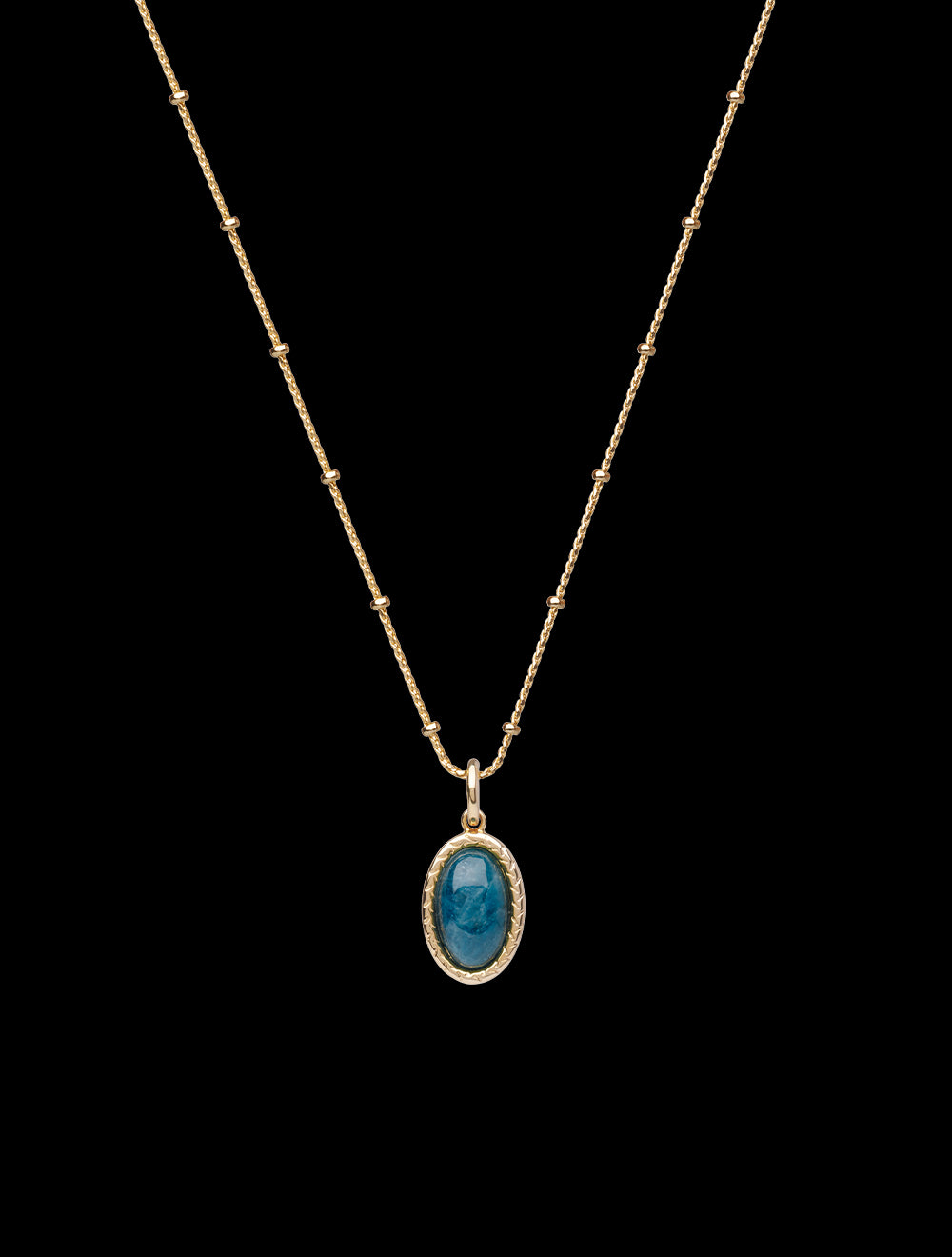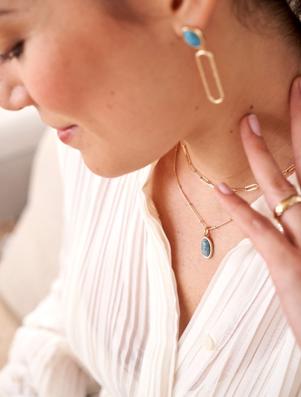 La ligne Aussière s'agrandit ! Une ligne graphique, maintenant disponible en Apatite bleue cabochon d'un serti clos matiéré. La couleur bleu vert ravira vos tenues classiques ou habillées.