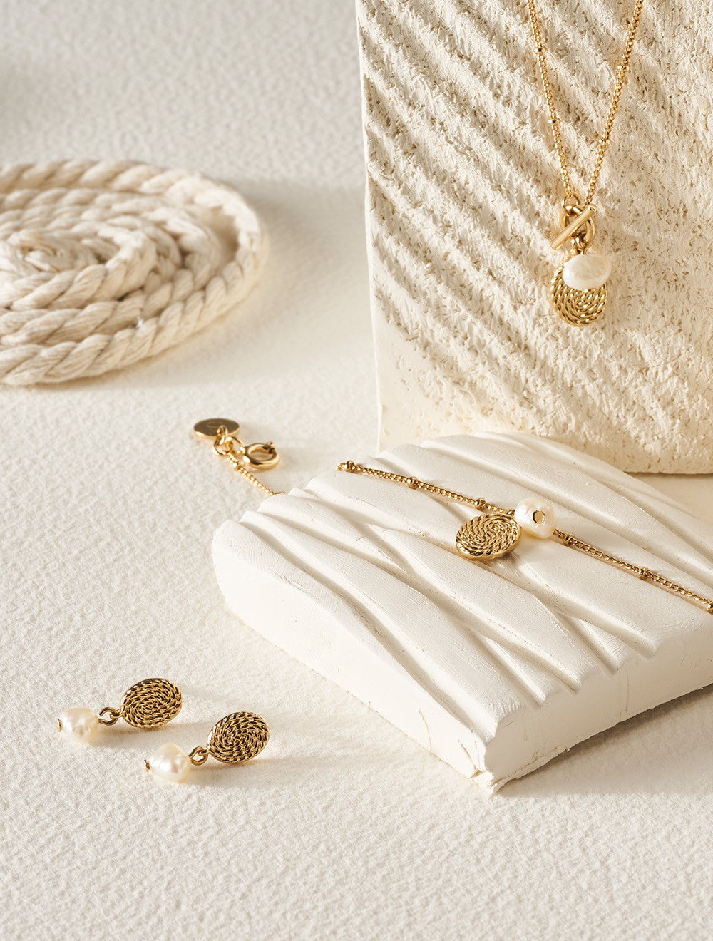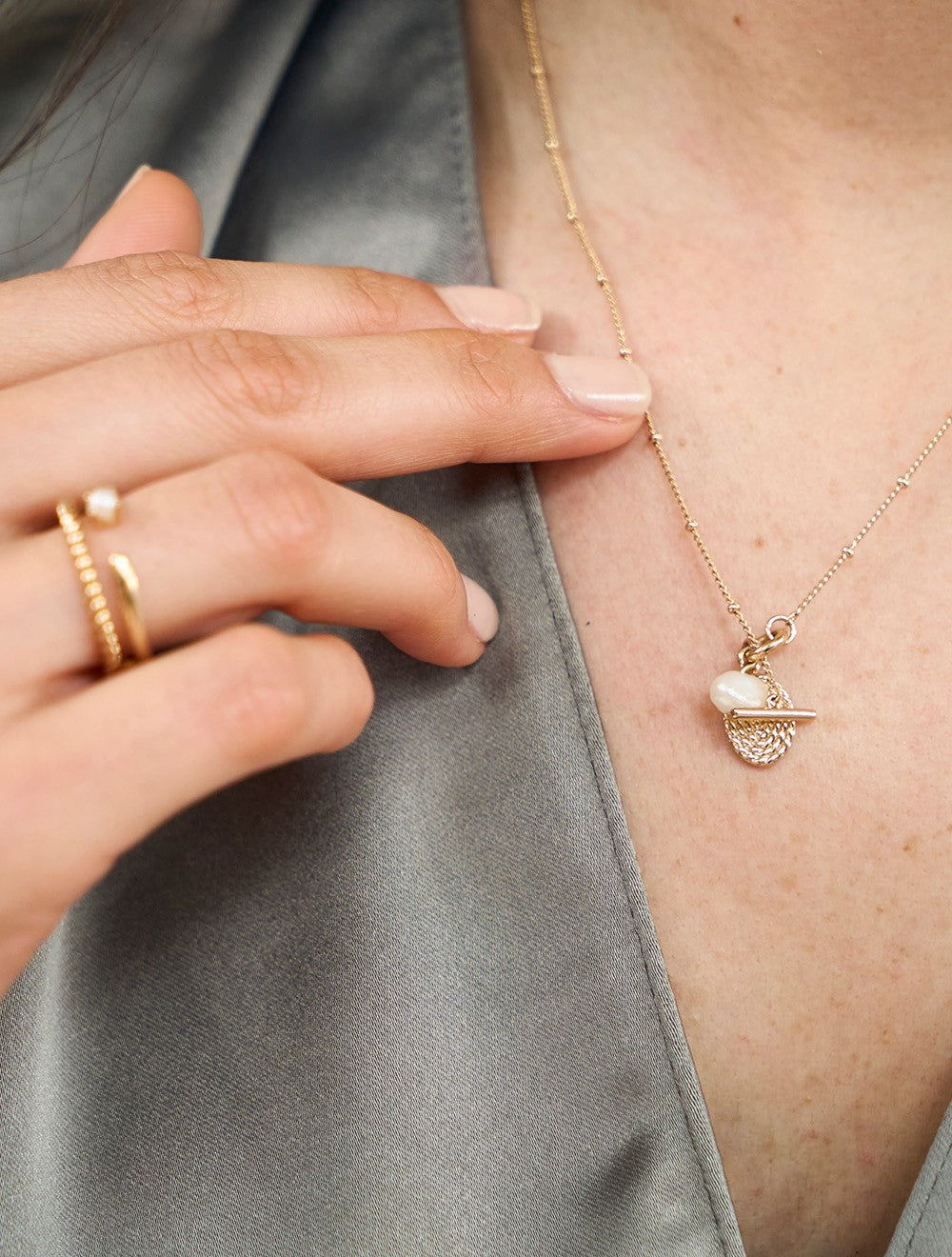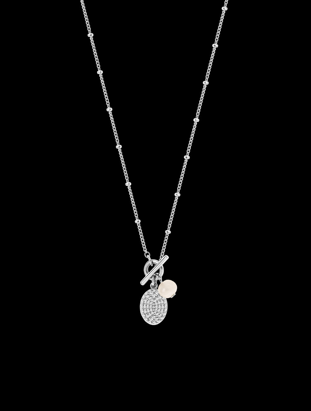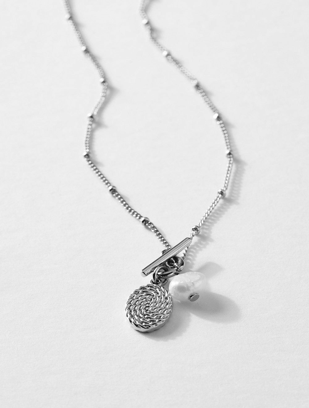 Le collier chaine argent est féminin et gracieux, orné d'une chaine avec de belles billes. Le fermoir en T modernise le collier et facilite la pose. La ligne Cabestan est discrète, sublimée de perle blanche. Sur cette ligne, un mélange de perles baroques d'imitation et de médailles matiérées. Elégance et modernité pour ces pièces intemporelles.