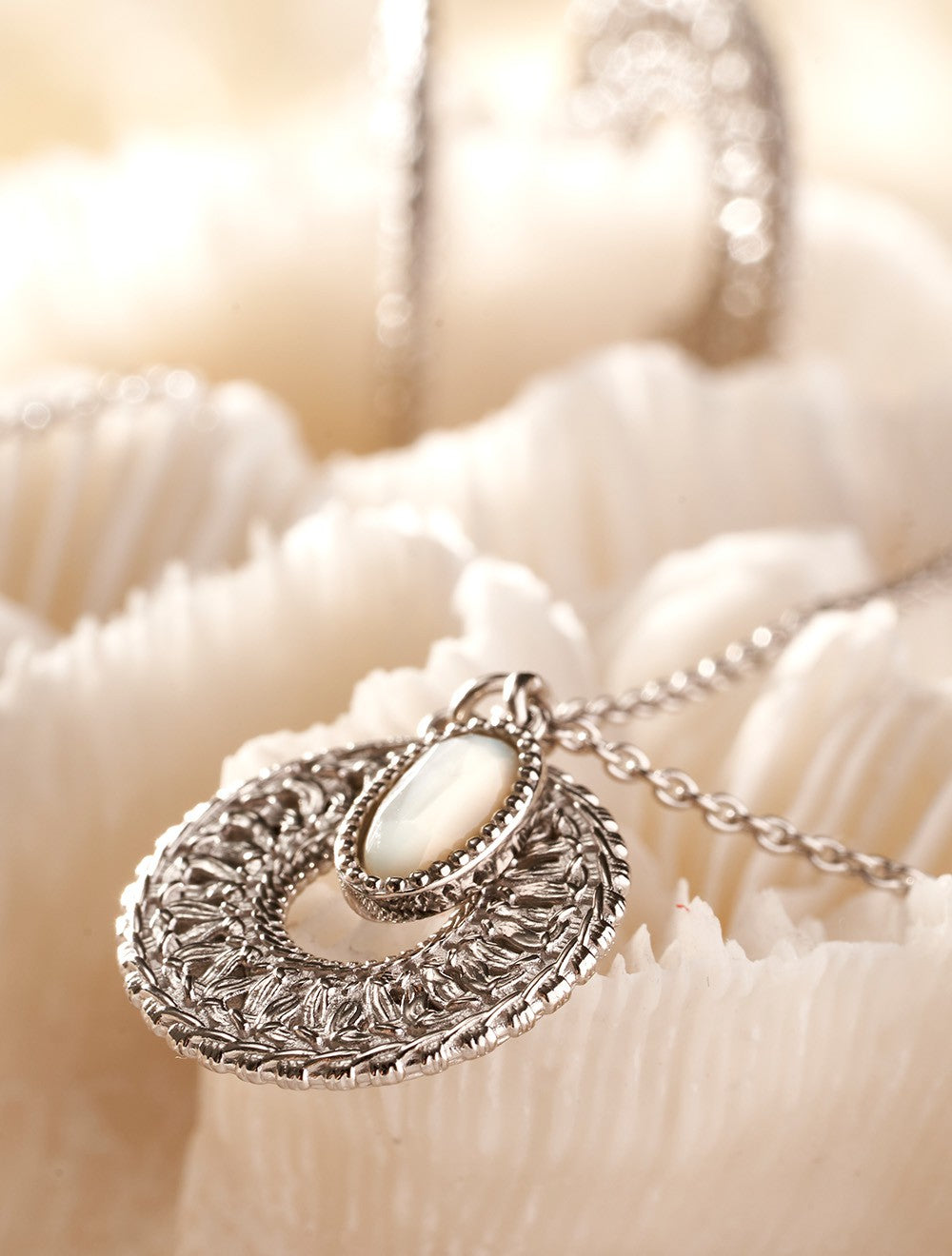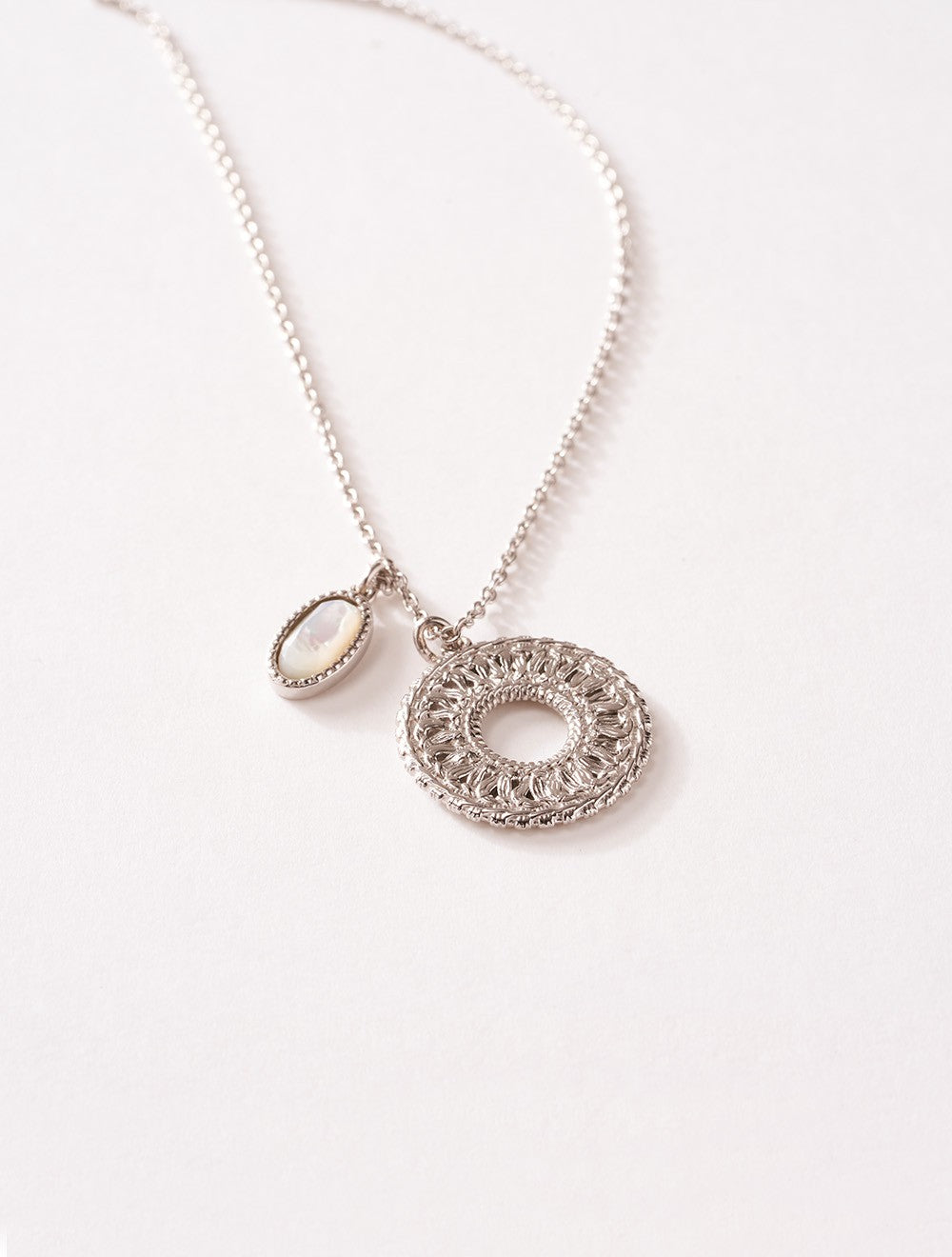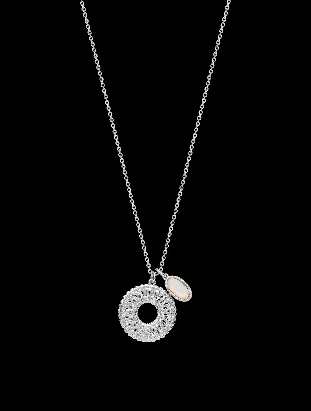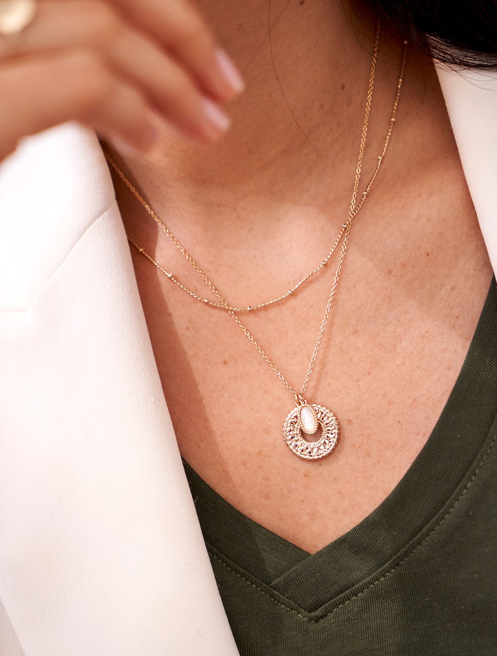 Inspirée du tissage, cette ligne joue sur les textures et L'effet de travail « fait main ». L'effet de matière texturé est sublimé de nacre cabochon au serti clos perlé. Ce collier texturé ira avec toutes vos tenues.