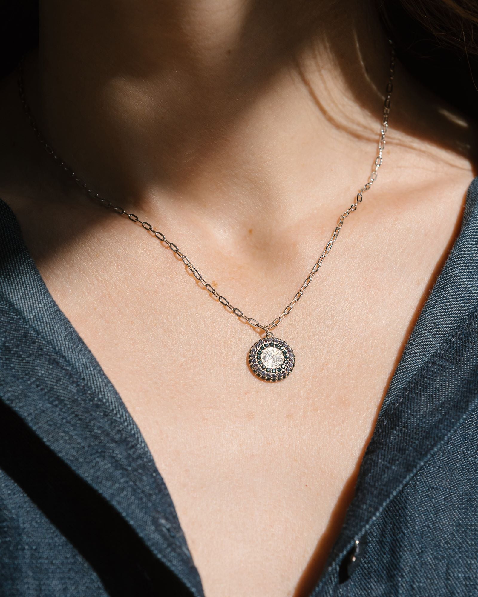 Collier en argent avec pendentif rond serti d’oxydes bleus. Pendentif circulaire monté sur chaîne à maillons.