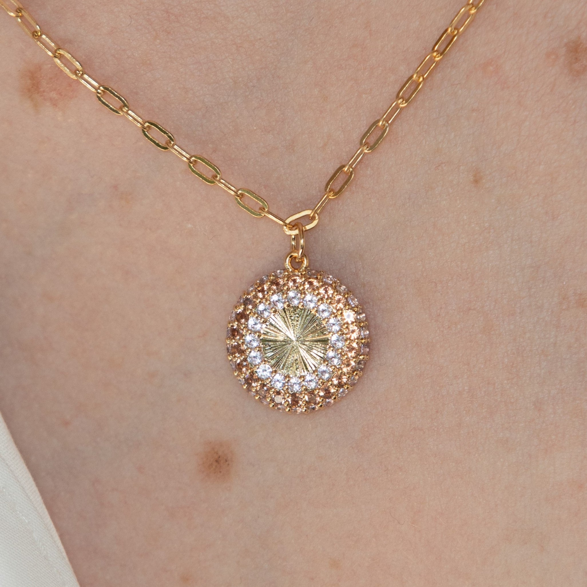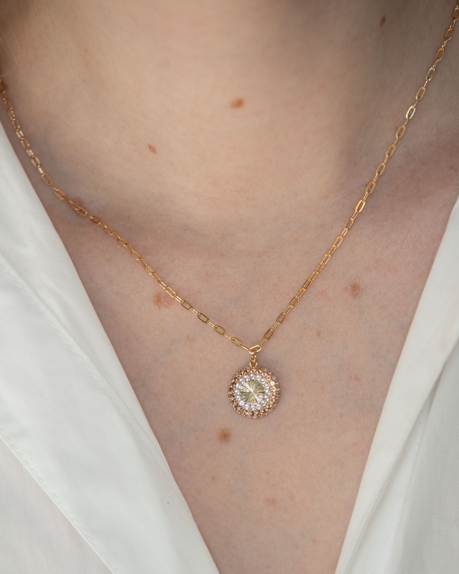 Collier en plaqué or serti d’oxydes de zirconium. Pendentif rond monté sur une chaîne à maillons.