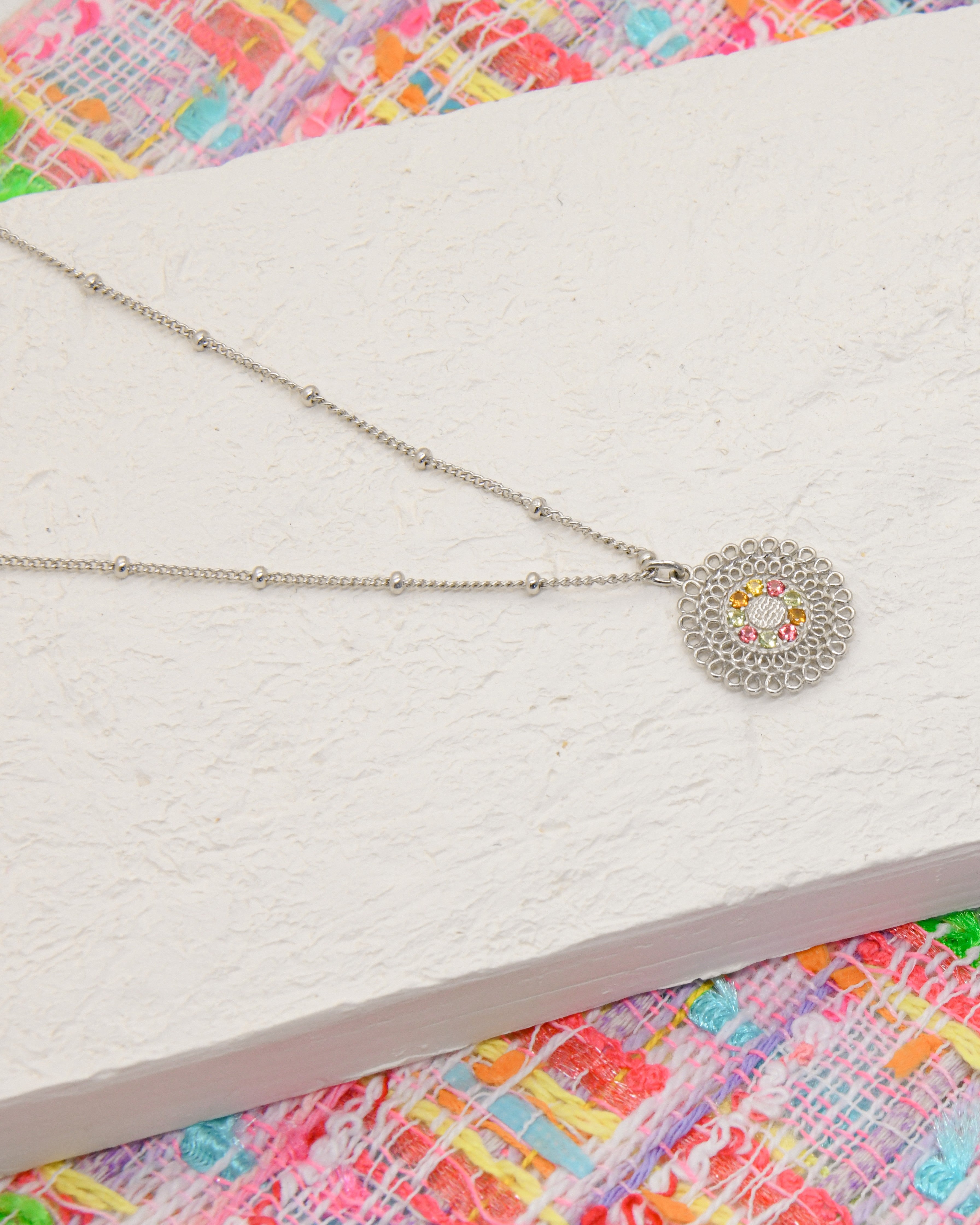 Collier à médaillon inspiré du tressage raffiné de l’osier. Son motif ajouré en argent capte la lumière et met en valeur des oxydes de zirconium multicolores, pour un éclat frais et contemporain. Une pièce facile à porter au quotidien, parfaite seule sur une encolure dégagée ou en superposition avec d’autres chaînes.