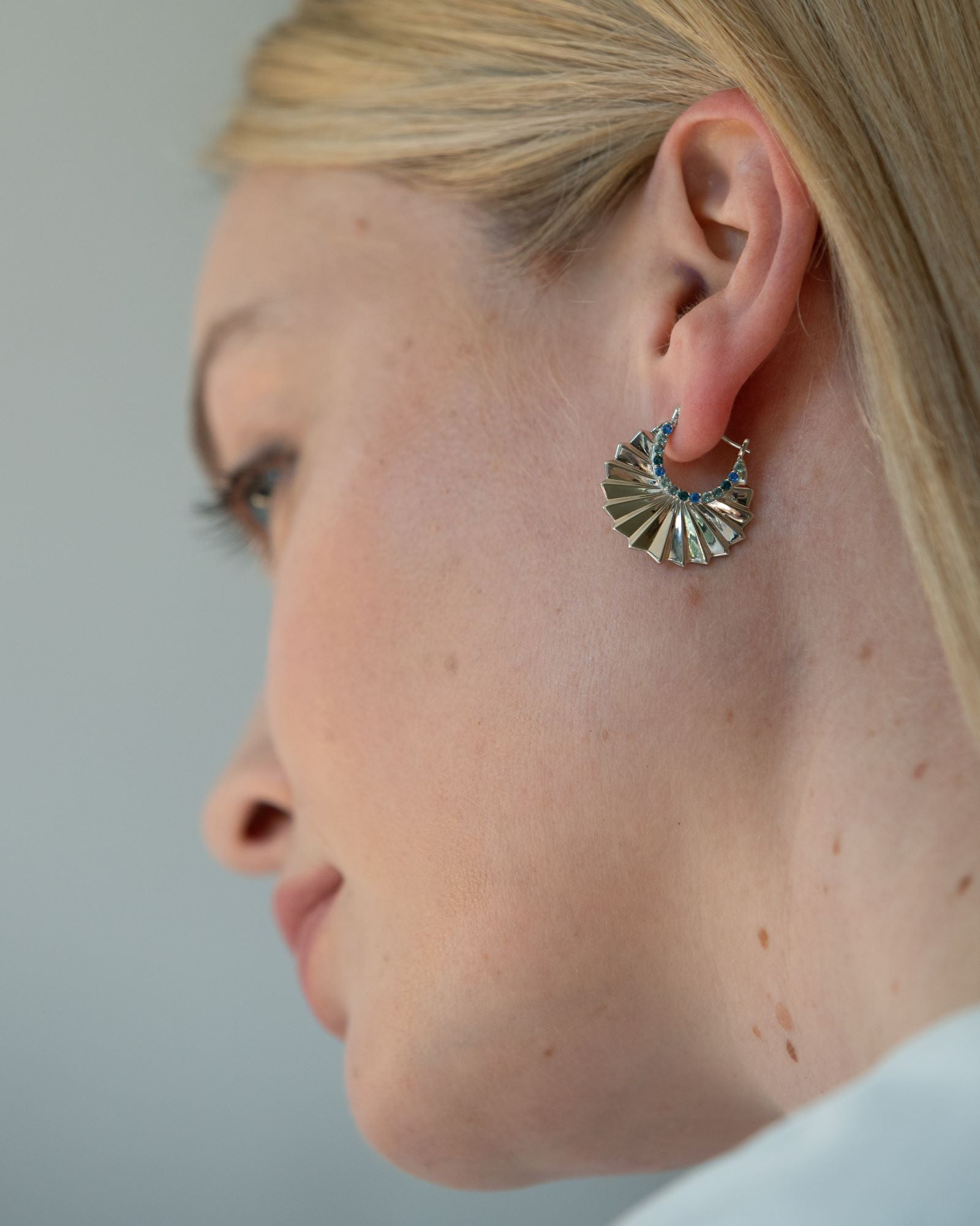 Créoles en argent à effet plissé, serties d’oxydes colorés. Un format graphique et rayonnant à porter en toutes occasions.