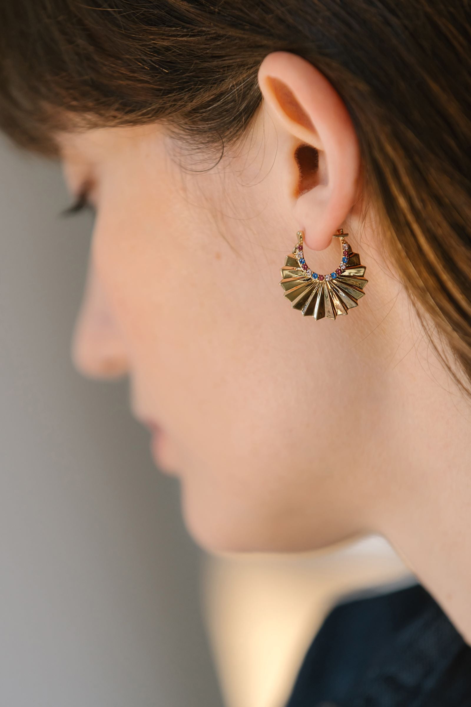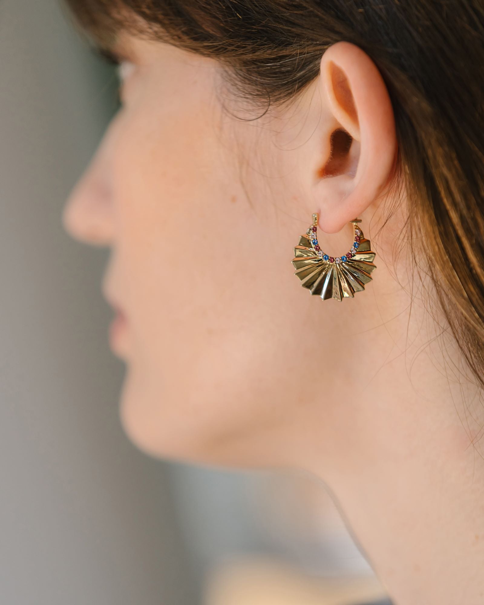 Boucles d'oreilles en plaqué or ornées d'oxydes aux teintes rose et bleu. Un volume plissé et vibrant pour une allure festive et audacieuse.