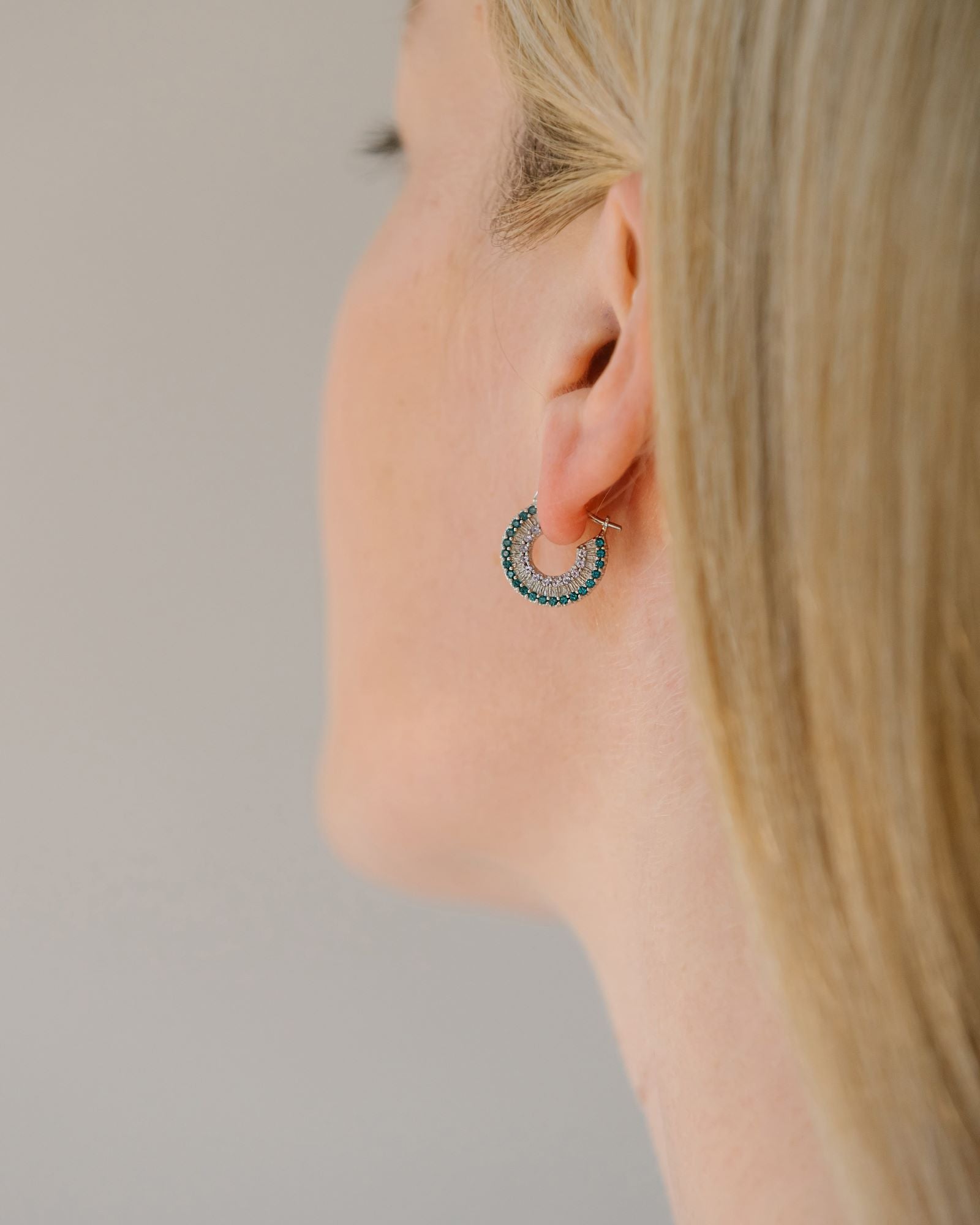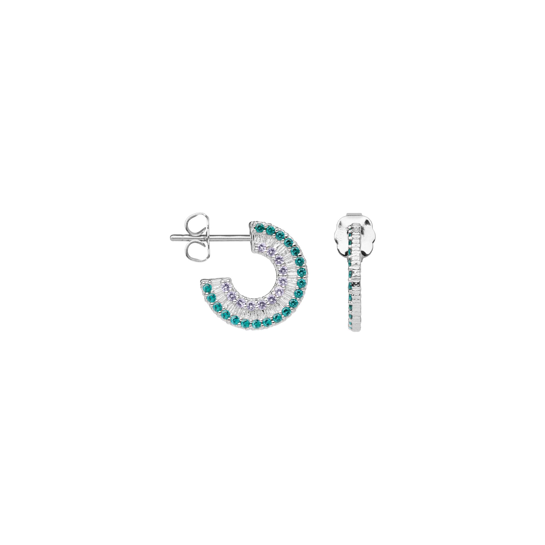 Créoles en argent serties d’oxydes. Design demi-lune et teintes contrastées pour un éclat délicat.