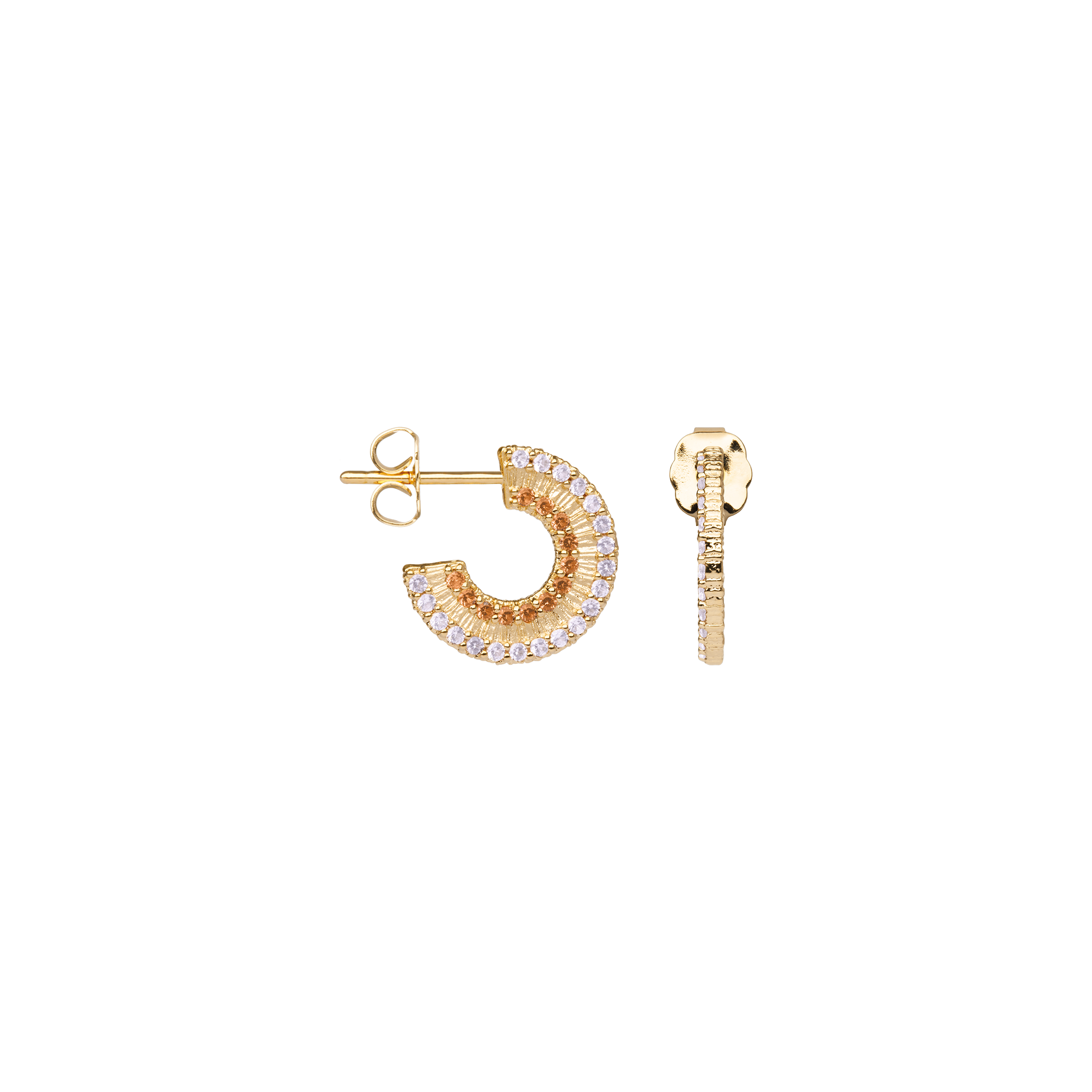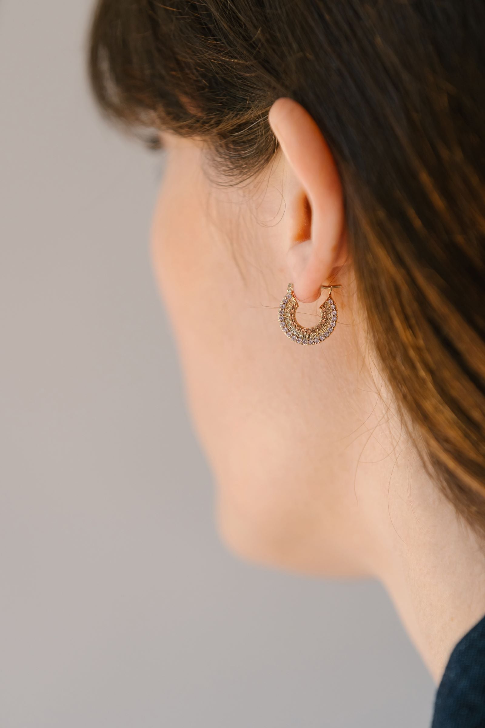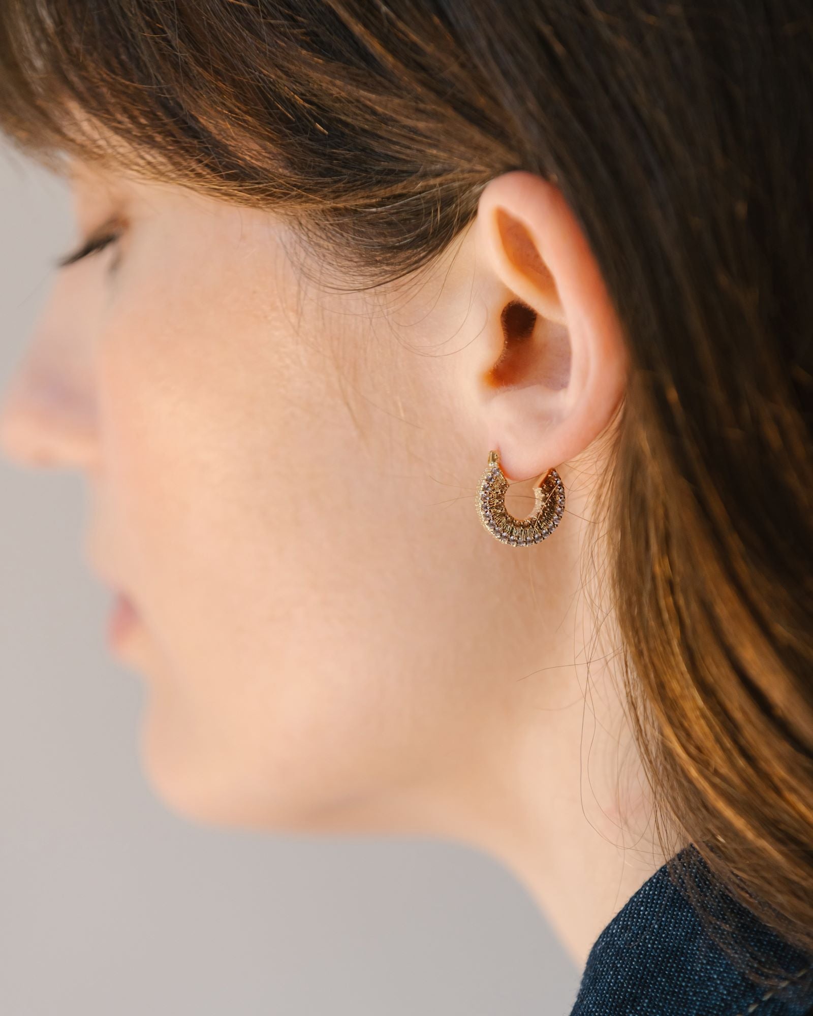 Créoles en plaqué or serties d’oxydes. Forme demi-lune et contraste de teintes pour une brillance subtile.