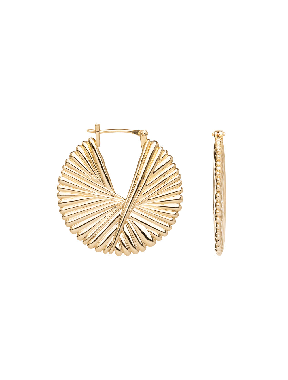 Créoles plates à texture. Un motif graphique et solaire qui structure le visage avec style.